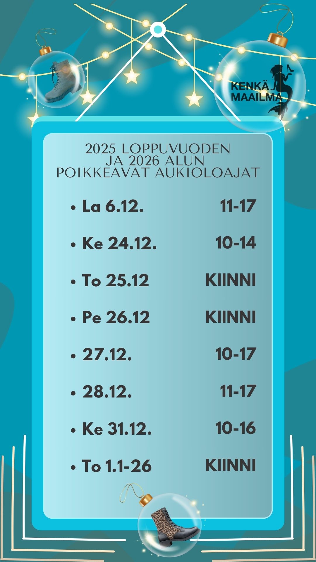 Alla olevassa kuvassa loppuvuoden 2025 poikkeavat aukioloajat: