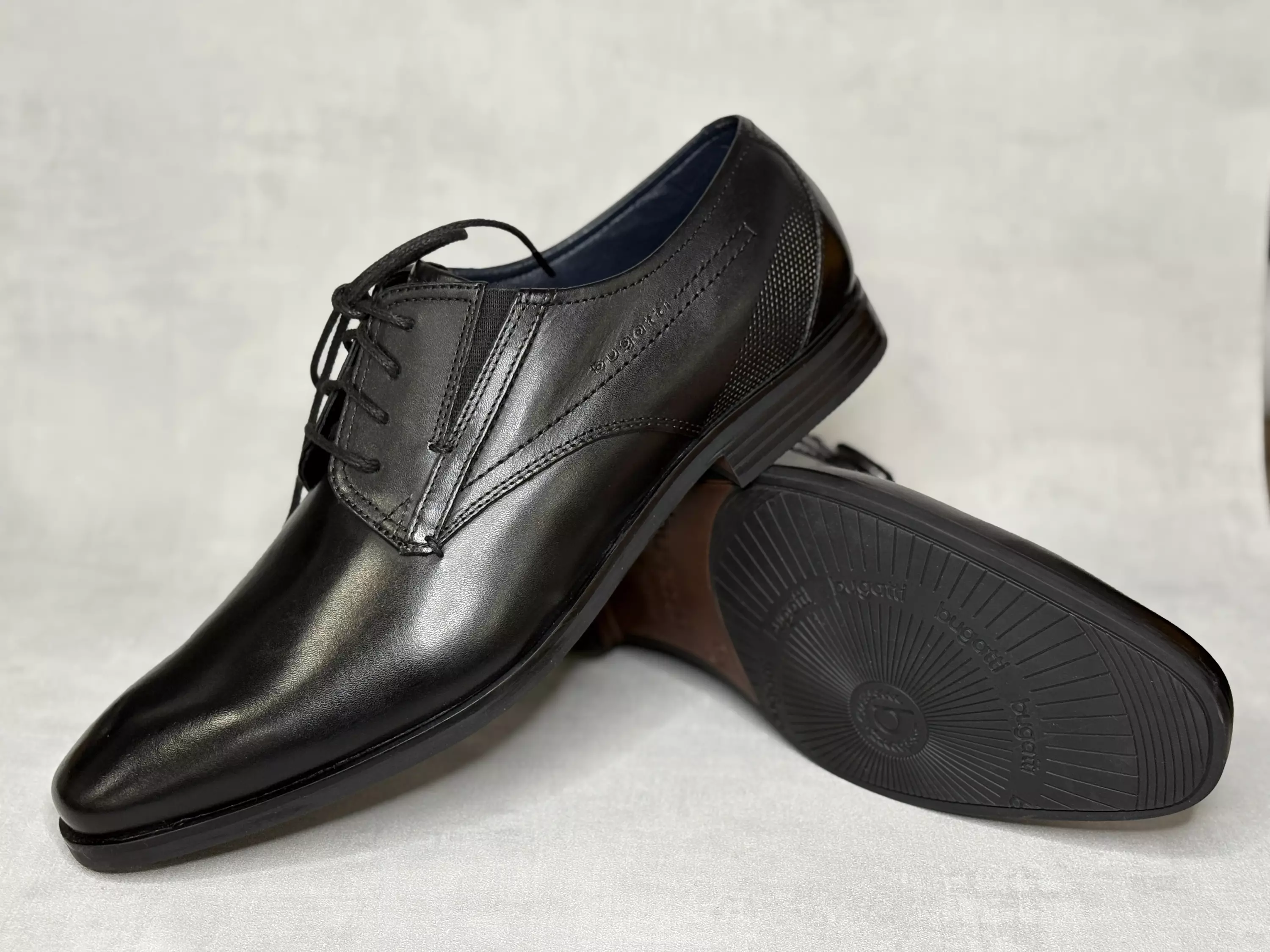 Mustat Bugatti puolikengät. Klassiset nauhalliset pukukengät. Nauhoituksen kummallakin puolella on istuvuutta parantavat venykkeet. Ulkosyrjällä kohokuvioinen bugatti-logo. Tyylikäs valina niin työhön kuin juhlaan.