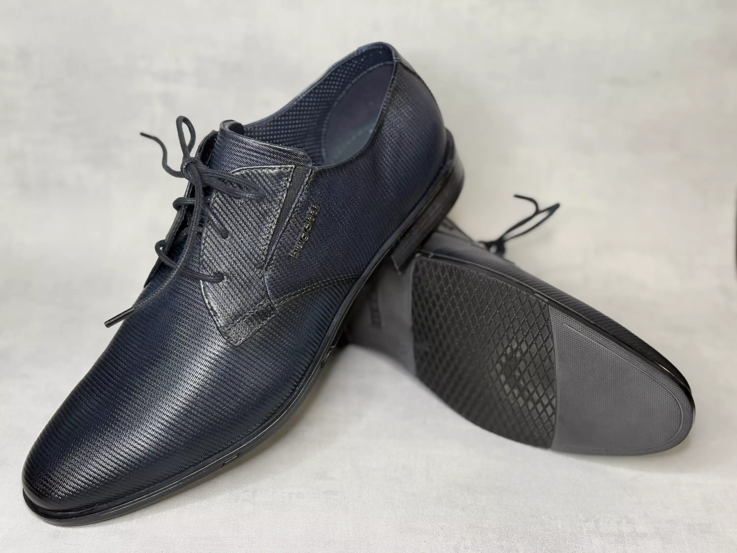 Tummansiniset Bugatti puolikengät. Tyylikäs pintakuviointi. Ulkosyrjällä metallinen bugatti-merkki. Nauhoituksen kummallakin puolella on pieni kenkien istuvuutta parantava venyke. Tyylikäs kapeneva kärki. Kannan korkeus noin 2,5cm ja pohjan korkeus päkiän alta noin 1cm.