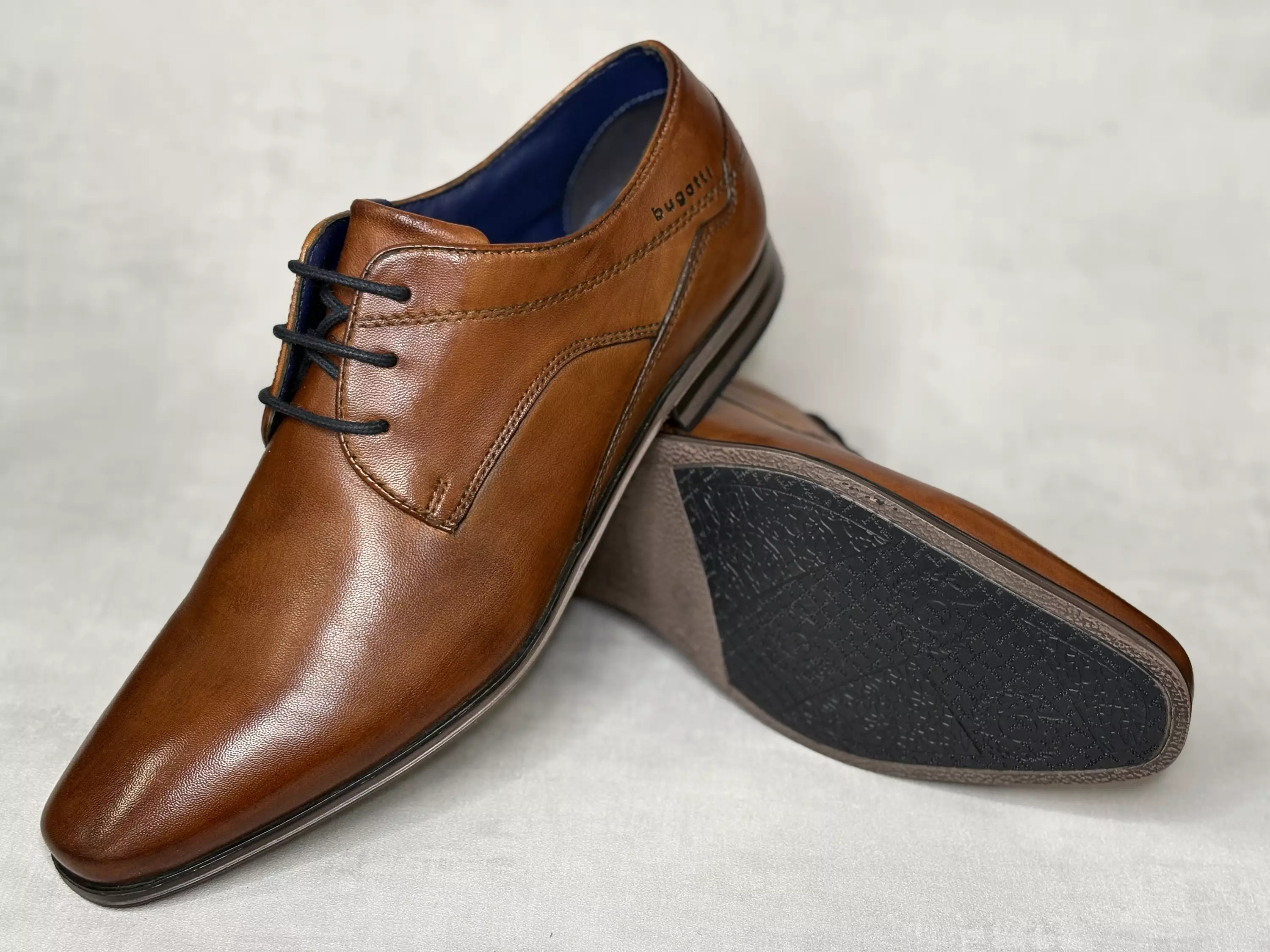 Konjakinruskeat nauhalliset Bugatti pukukengät. Tyylikäs valinta niin töihin kuin juhlaankin. Tyylikäs kapeneva kärki. Kannan korkeus noin 2cm ja pohjan korkeus päkiän alta noin 1cm.