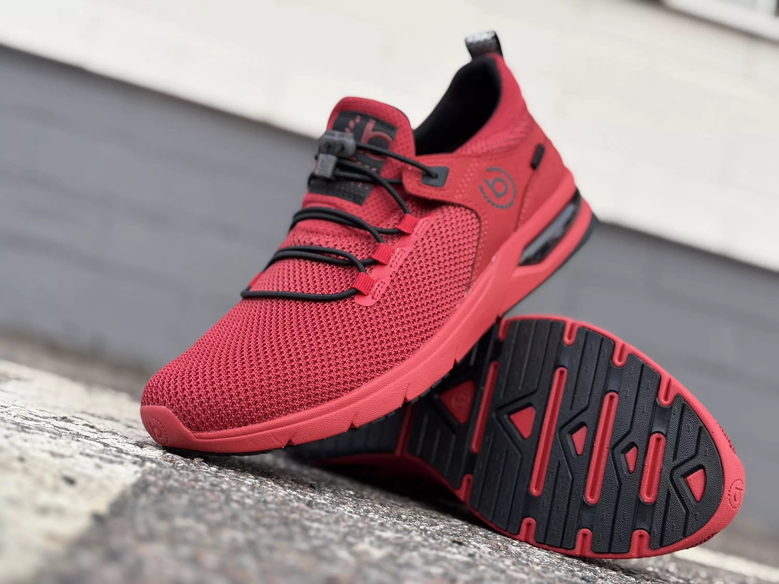 Punaiset Bugatti kävelykengät. Kengät on varustettu säädettävillä mustilla venykenauhoilla. Tekstiilinen neulosmateriaalinen kärkiosa, synteettinen mattapintainen kantaosa. Kannassa vetolenkki. Vaihdettavat pohjalliset, joiden tilalle sujautat tarvittaessa omia tarpeitasi parhaiten vasaavat pohjalliset. Kannan korkeus noin 3,5cm ja pohjan korkeus päkiän alta noin 2cm.