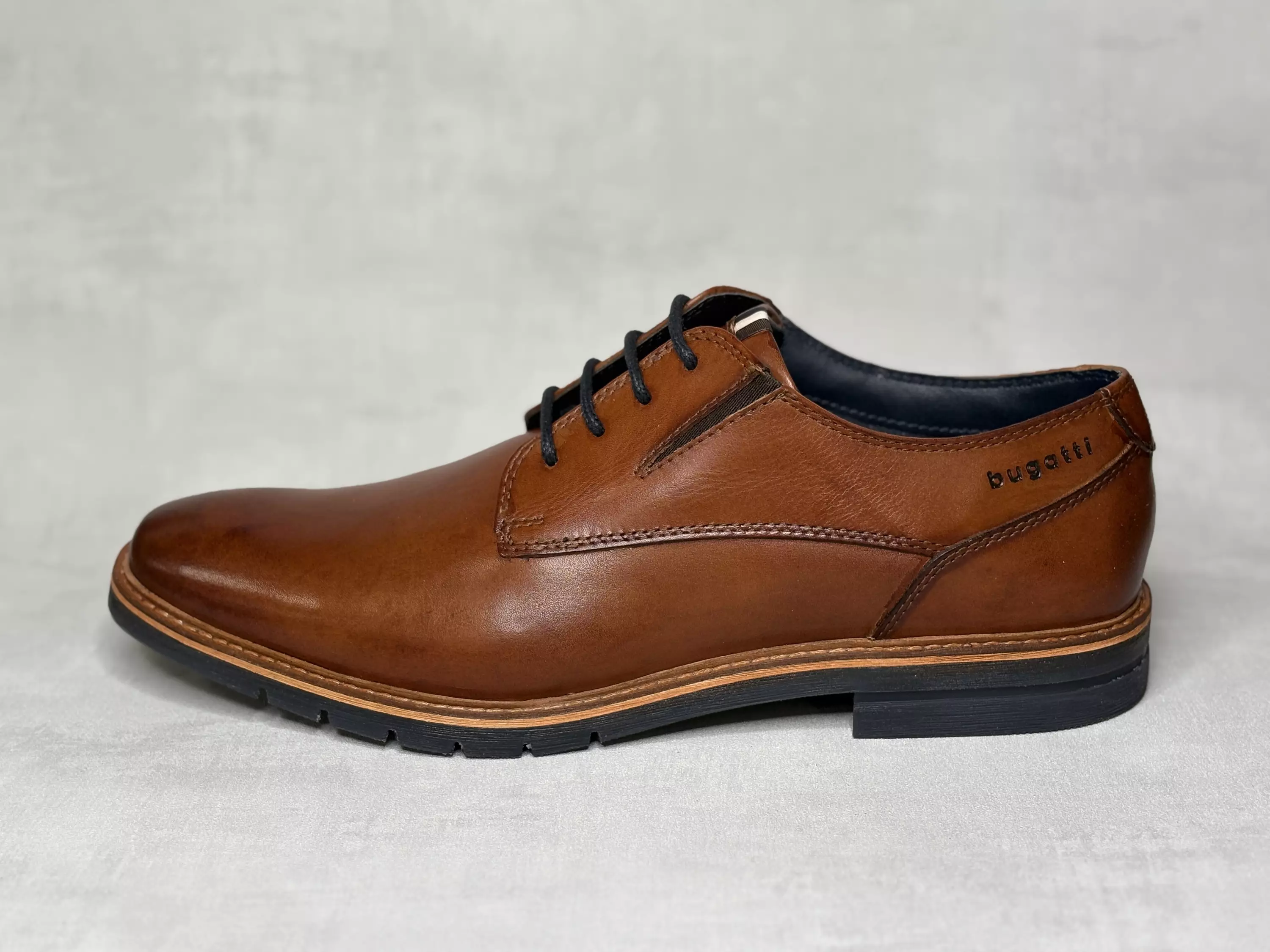 Konjakinruskeat Bugatti puolikengät. Varsin klassiset nauhalliset pukukengät. Nauhoituksen molemmilla puolilla on pienet tummanruskeat venykkeet parantamassa kengän istuvuutta. Maltilliset leikkaukset. Ulkosyrjällä bugatti-logo. Kenkien väri muuttuu hieman tummemmaksi kapenevaa kärkeä kohti mentäessä.