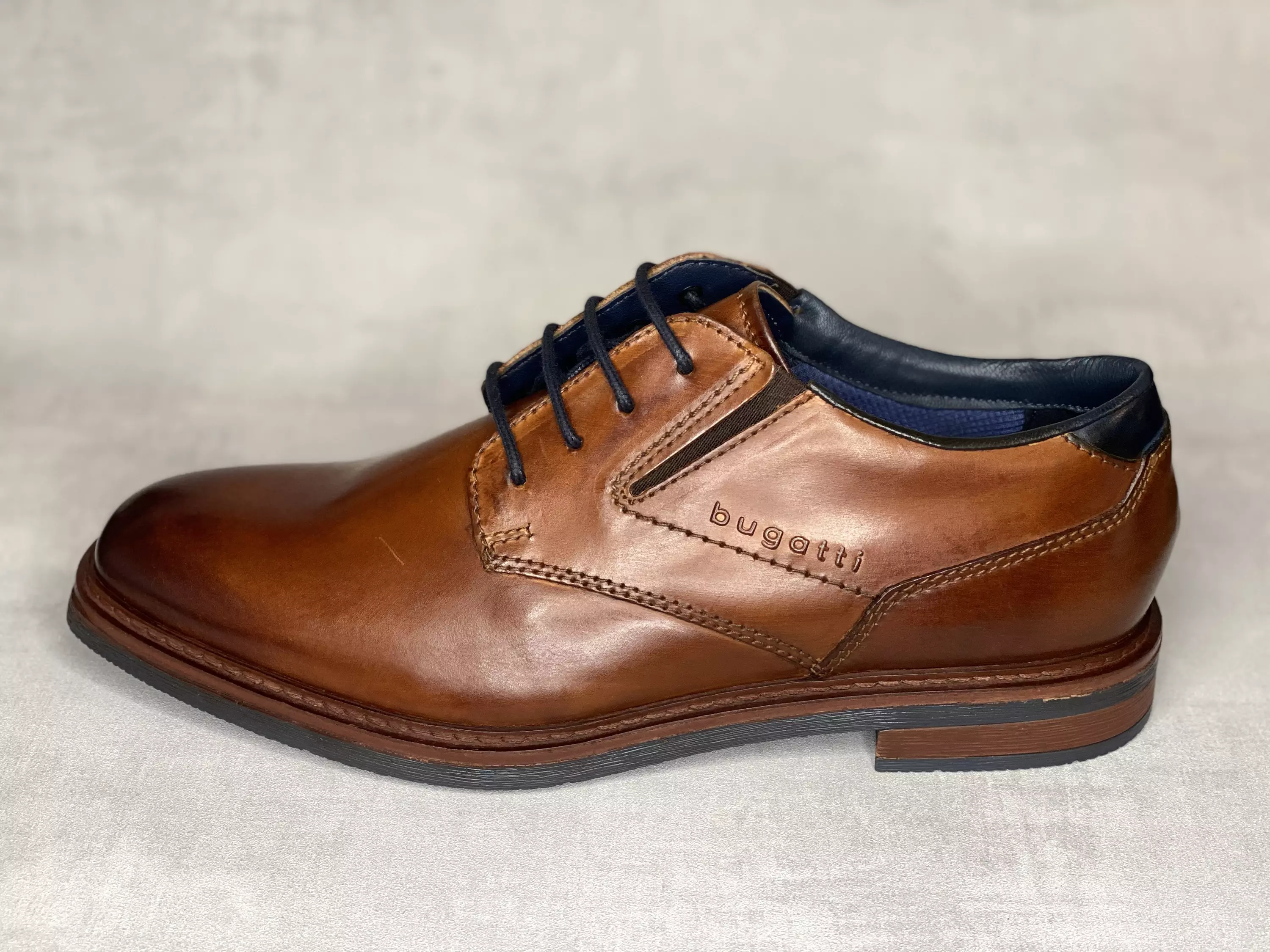 Konjakinruskeat Bugatti pukukengät, joissa aksenttivärinä ripaus tummansinistä. Nauhojen sivuilla on pienet istuvuutta parantavat venykkeet. Tyylikäs kapeneva kärki.