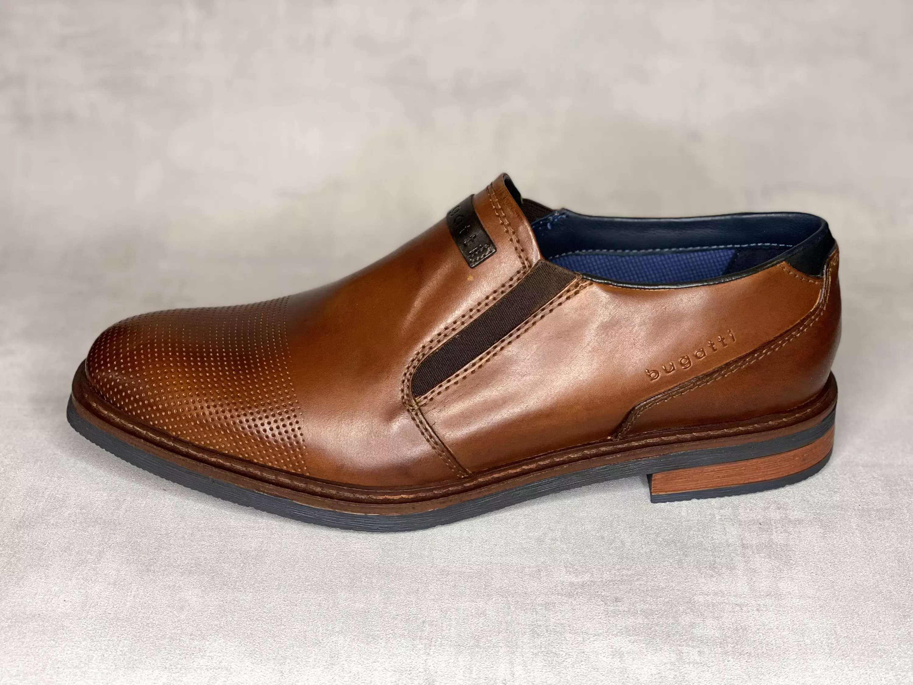 Konjakinruskeat nauhattomat Bugatti puolikengät. Sisä ja ulkosyrjällä pukemista helpottavat ja istuvuutta parantavat venykkeet. Kapeneva kärki, jossa perferoitu kärkikuvio.