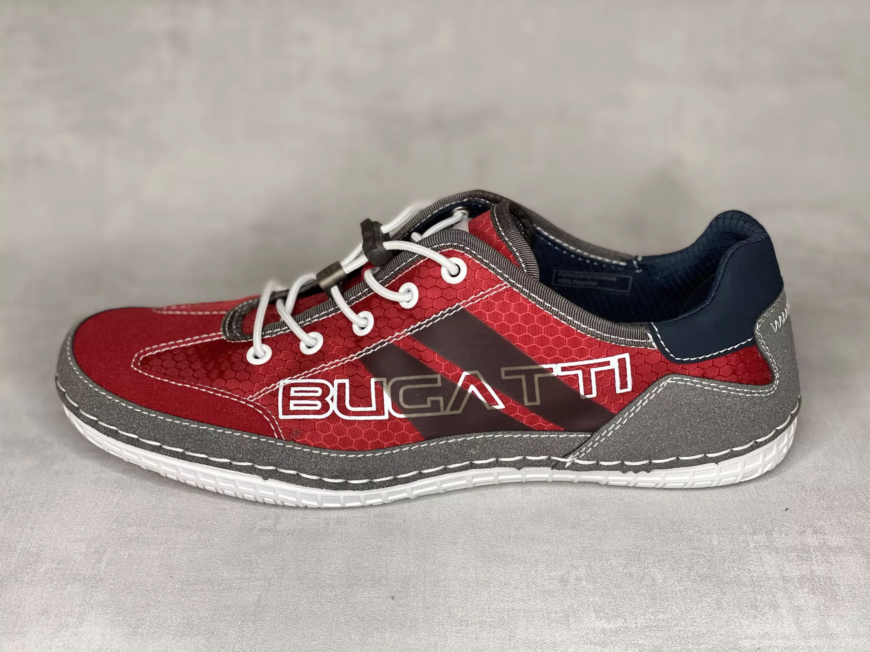 Punaiset Bugatti tennarit. Punaisessa pinnassa kennokuviointi. Aksenttivärinä harmaata ja mustaa, kannassa pieni kappale sinistä. Valkoiset säädettävät venykenauhat. Vaihdettavat pohjalliset, joiden tilalle sujautat tarvittaessa omia tarpeitasi parhaiten vastaavat pohjalliset.