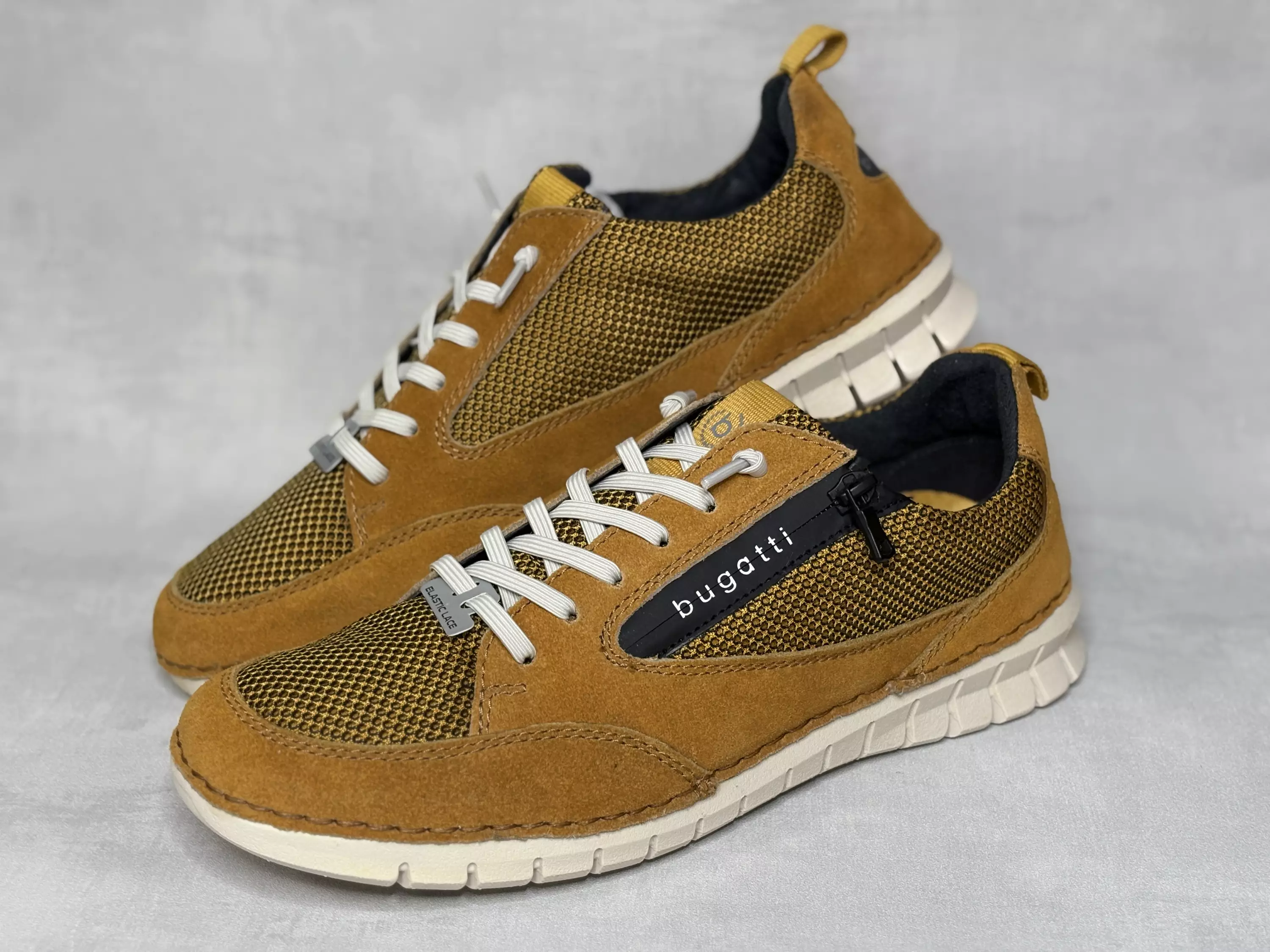 Keltaiset venykenauhaiset Bugatti tennarit. Murretun keltaiset nahkaosiot ja tekstiilinen musta-keltainen verkkokangas antavat tälle kengälle runsaasti ilmettä! Valkoiset venykenauhat ja ulkosyrjälle sijoitettu pukemista vauhdittava vetoketju. Vaihdettava pohjalliset, joiden tilalle sujautat tarvittaessa omia tarpeitasi parhaiten vastaavat pohjalliset. Kannan korkeus noin 3cm ja pohjan korkeus päkiän alta noin 2cm.