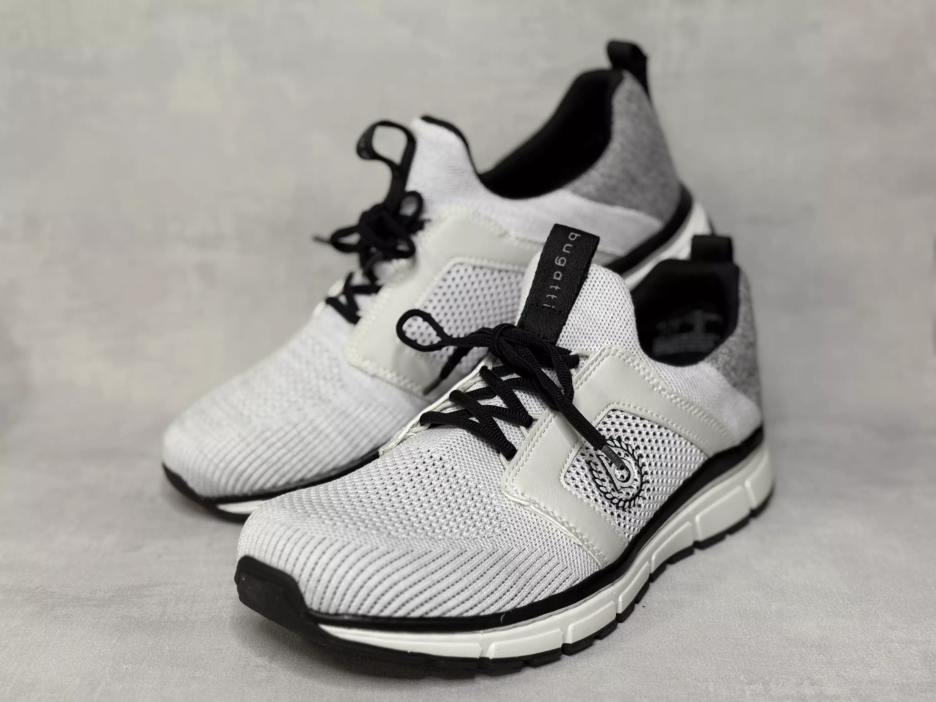 OffWhite valkoiset Bugatti lenkkarit. Joustavilla mustilla nauhoilla varustetut kävelykengät. Kannassa aksenttivärinä meleerattua harmaata. Kannassa ja iltissä musta tekstiilnen vetolenkki. Ulkosyrjällä Bugatin b-logo. Vaihdettava pohjalliset, joiden tilalle sujautat tarvittaessa omia tarpeitasi parhaiten vastaavat pohjalliset. Kannan korkeus noin 3cm, pohjan korkeus päkiän alta noin 1,5cm.