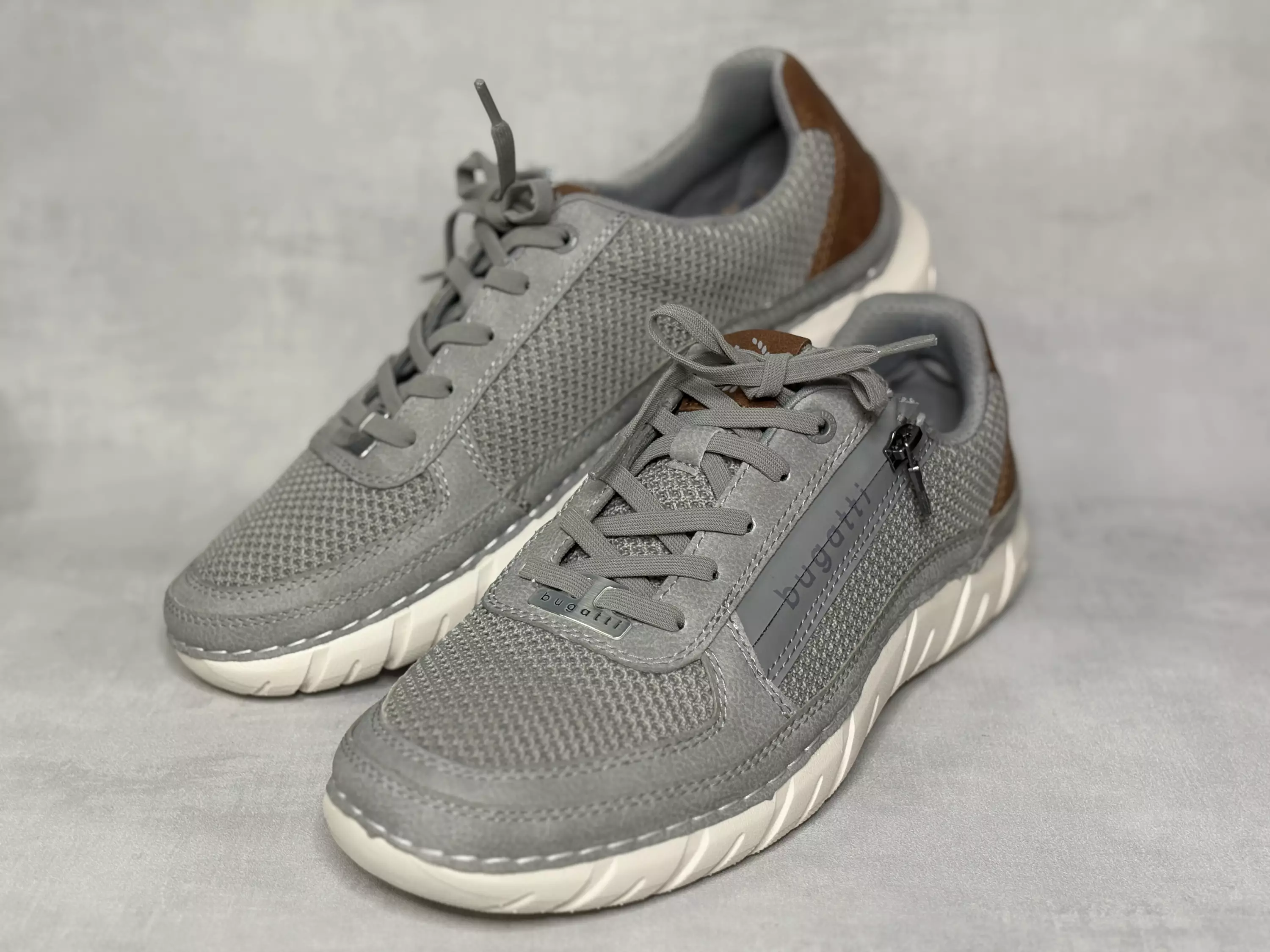 Vaaleanharmaat Bugatti tennarit. Aksenttivärinä kannassa ja iltissä konjakinruskeaa. Ulkosyrjällä pukemista vauhdittava vetoketju. Venykenauhojen avulla säädät kengät omaan jalkaan sopivan kireälle. Vaihdettavat pohjalliset, joiden tilalle vaihdat tarvittaessa omia tarpeitasi parhaiten vastaavat pohjalliset. Kannan korkeus noin 3,5cm ja pohjan korkeus päkiän alta noin 2,5cm.