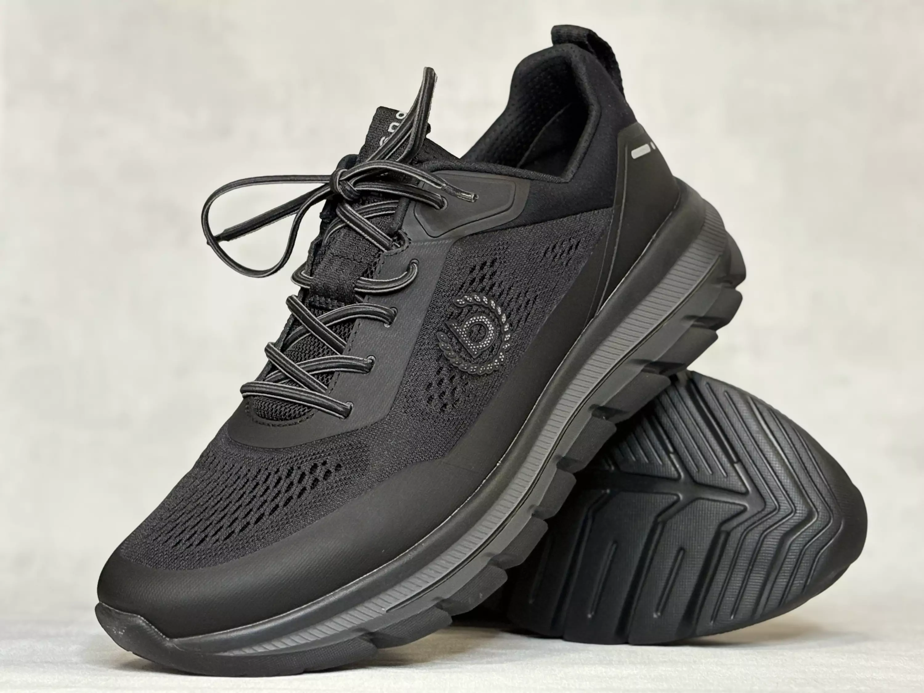 Mustat Bugatti kävelykengät. Joustavilla nauhoilla varustetut tekstiilipintaiset kävelykengät. Vaihdettavat pohjalliset, joten tarvittaessa sujautat kenkiin omia tarpeitasi parhaiten vastaavat pohjalliset. Kannan korkeus noin 4,5cm ja pohjan krokeus päkiän alta noin 2,5cm.