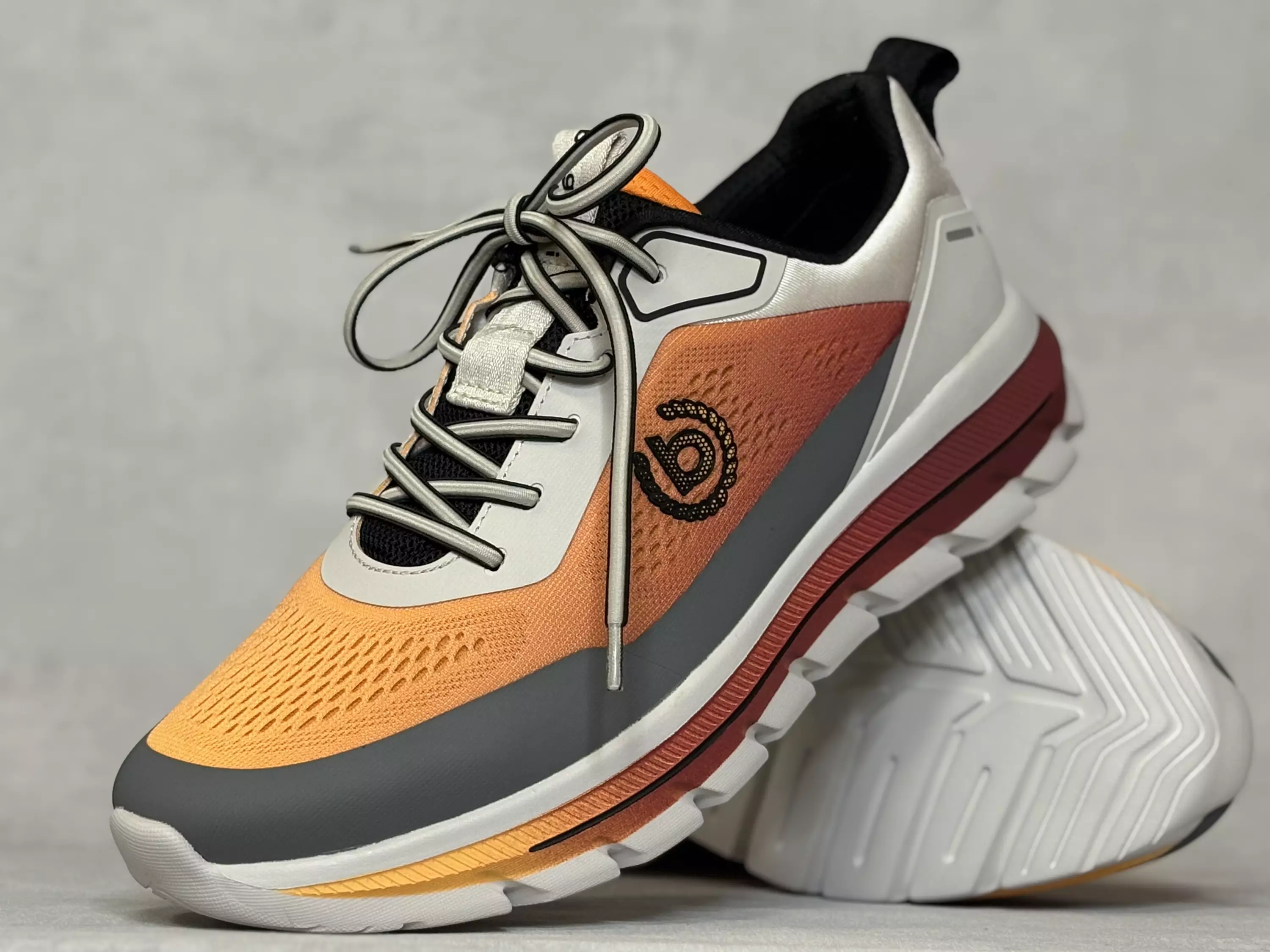 Moniväriset Bugatti kävelykengät. Kärjen liukuväri vaihtuu oranssista ruosteenpunaiseen. Harmaa raita kärjessä ja lunnonvalkoista kannassa. Myös ulkopohjan sivussa liukuväri. Joustavat venykenauhat. Vaihdettavat pohjalliset, joide tilalle sujautat tarvittaessa omia tarpeitasi parhaiten vastaavat pohjalliset. Lestimitoitus normaali. Kannan korkeus noin 4,5cm, pohjan korkeus päkiän alta noin 2cm.