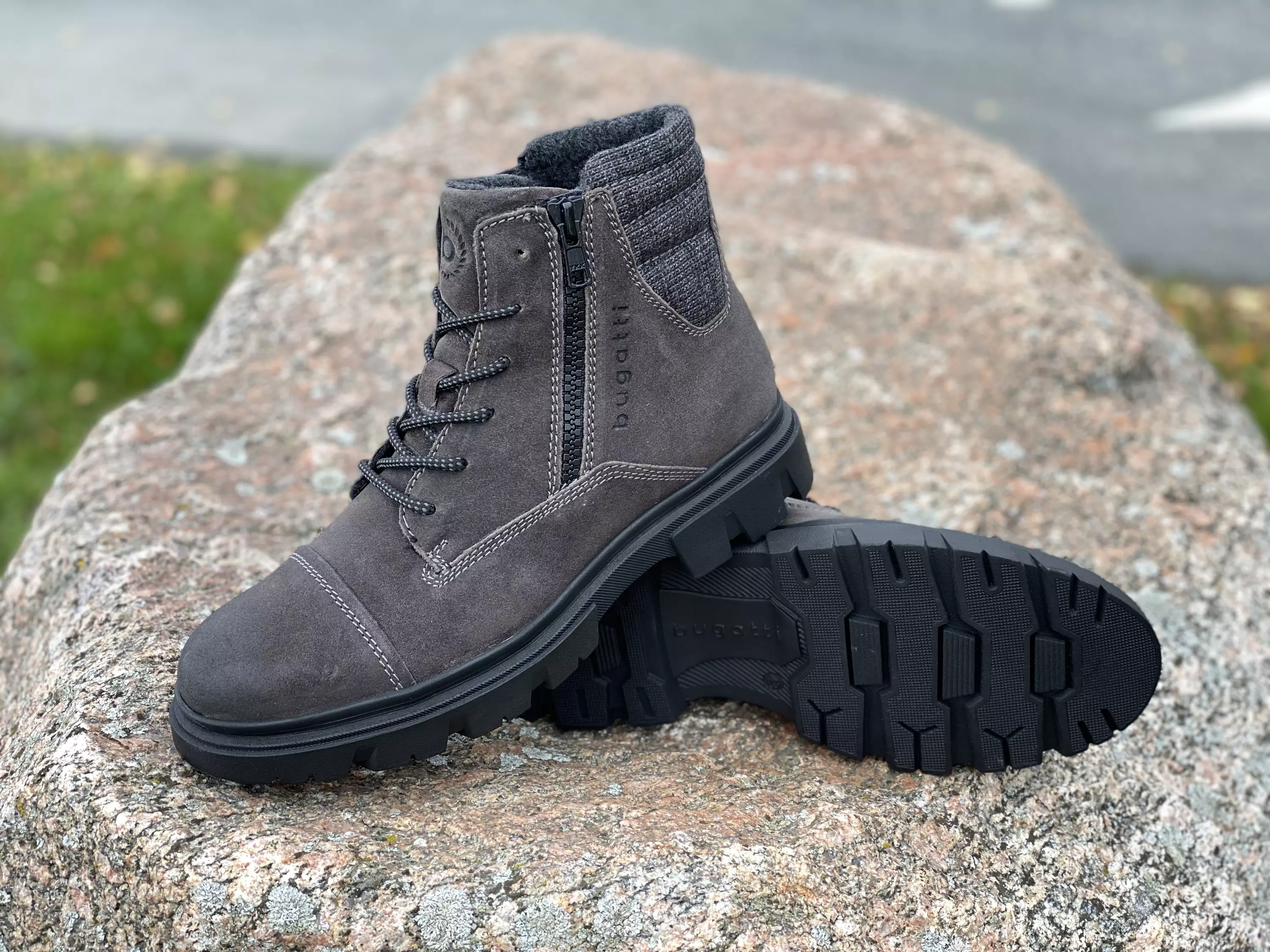 Tummanharmaat Bugatti Fabello nilkkurit. Huopavuoriset nahkanilkkurit. Varren yläosassa tekstiilinen osio yksityiskohtana sekä ilmettä antava vetoketju, joka helpottaa myös pukemista. Vetoketjun vieressö Bugatti-logo. Vaaleanharmaalla langalla toteutetut tikkaukset antavat nekin ilmettä näille nilkkureille, samoin harmaankirjavat kengännauhat. Vaihdettavat Air Clima System-pohjalliset, joten tarpeen vaatiessa niiden tilalle sujahtaa omia tarpeitasi parhaiten vastaavat pohjalliset.
