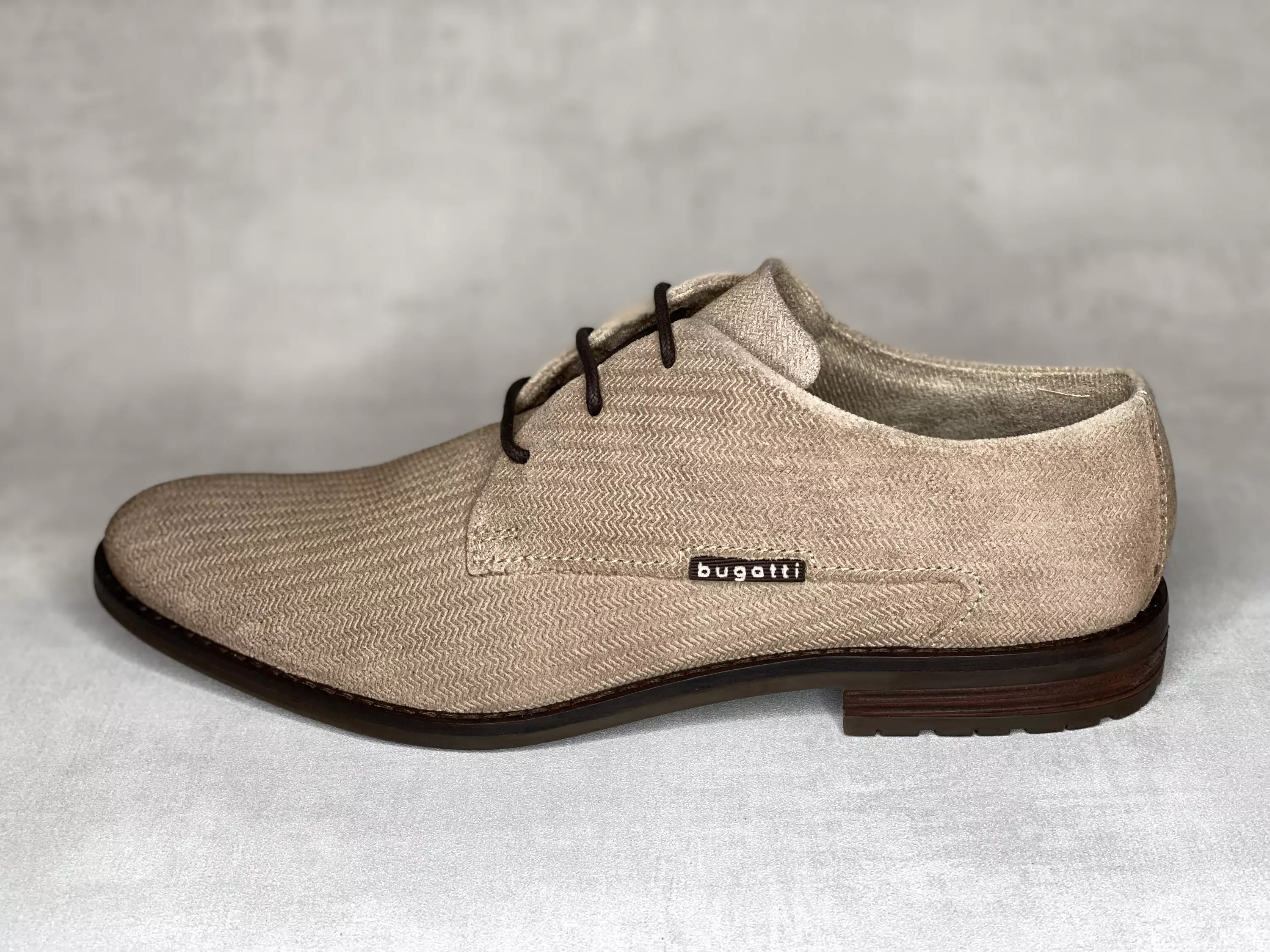 Beiget Bugatti Zanerio pukukengät. Näyttävällä siksak-pintakuviolla koristetut pukukengät ovat näyttävä valinta. Tummanruskeat nauhat. Ulkosyrjällä yksityiskohtana pieni bugatti kangasmerkki.