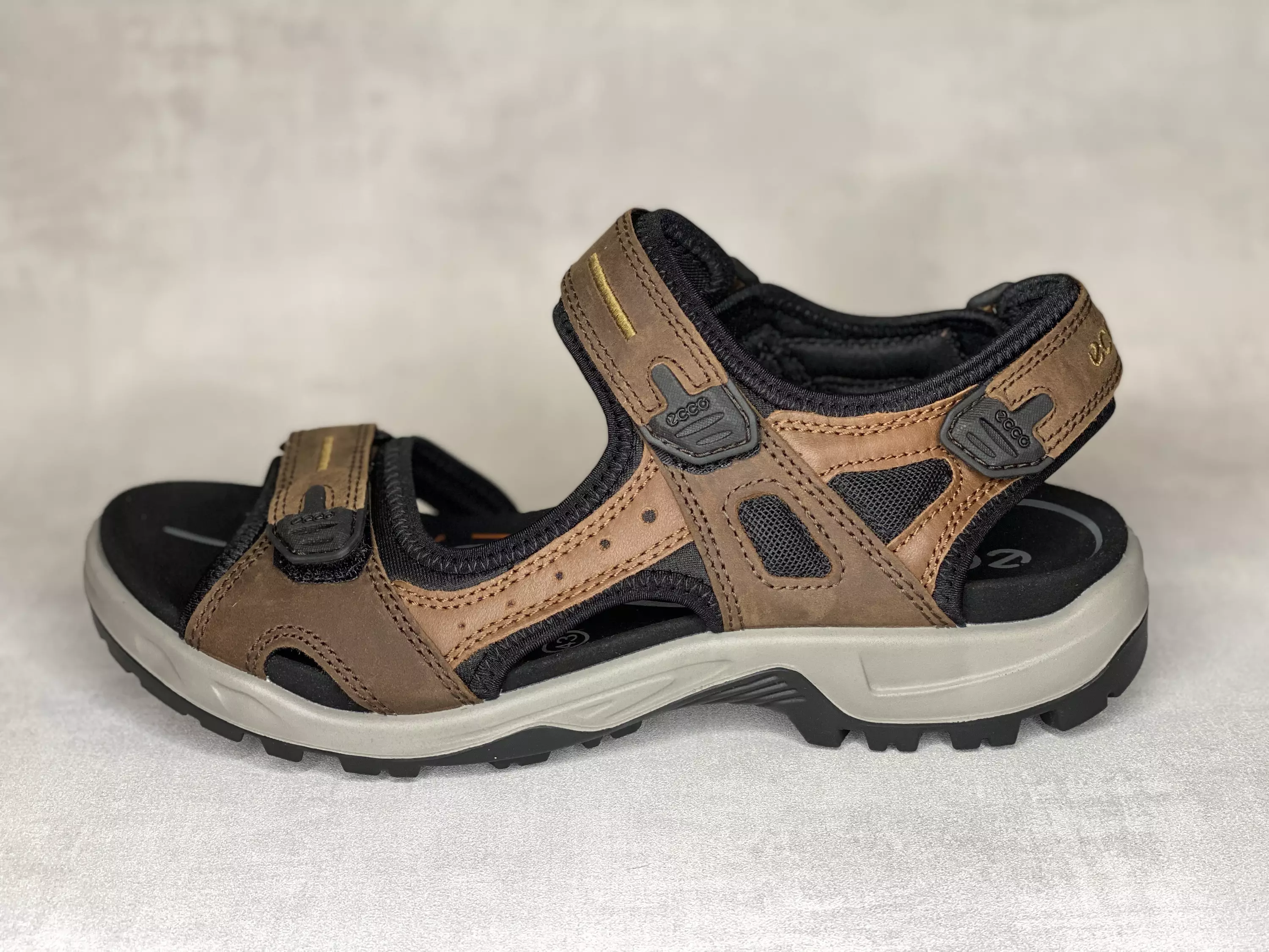 Ruskeat kolmiremmiset Ecco Offroad sporttisandaalit. ECCO-jalkineet valmistetaan huolellisesti sopimaan jalkaan, eikä toisinpäin ja tämä logiikka toimii myös näiden ruskeiden sandaalien kohdalla. Kengän pinta on nahkaa ja vuori tekstiiliä. Sandaaleiden istuvuutta omaan jalkaan voi säätää kolmella erillisellä tarraremmillä. Pitävä pohja. Kannan korkeus noin 3,5cm, edestä noin 2cm.