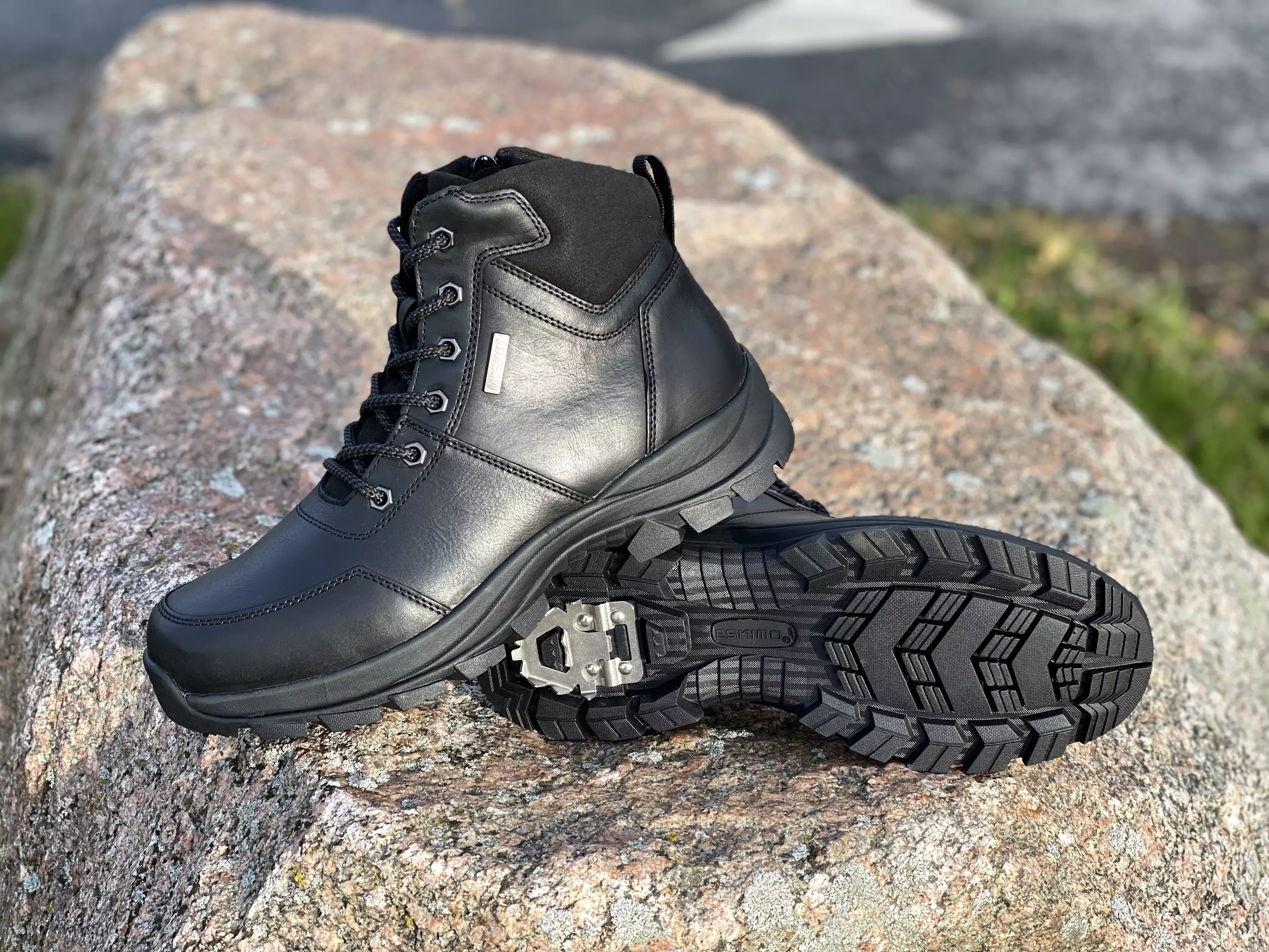 Mustat miesten Eskimo nilkkurit. Käännettävillä kantapiikeillä varustetut vedenpitävät nahkanilkkurit. Sisäsyrjällä pukemista helpottava vetoketju. Nauhojen avulla kengät on helppo säätää omaan jalkaan sopivan kireälle. Pohjalliset joustavat ja mukautuvat jalan alla. Pohjalliset ovat myös vaihdettavat, joten tarpeen vaatiessa vaihdat kenkiin omia tarpeitasi parhaiten vastaavat pohjalliset. Kantapiikit on helppo kääntää tarvittaessa käyttöön ja pois.
