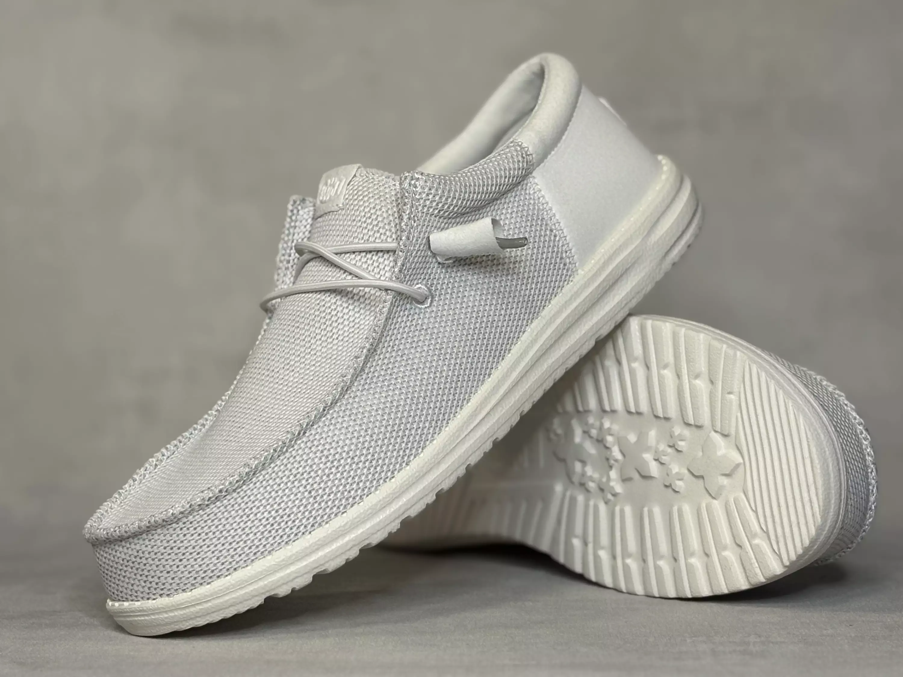 Vaaleanharmaat Hey Dude Wally Funk Mono - Ghosted kävelykengät. Kiireestä kantapäähän vaaleanharmaat kesäkengät. Leveä lesti ja vaihdettava pehmeä pohjallinen, joten tähän kenkään sujahtavat vaivattomasti omaan jalkaasi parhaiten sopivat pohjalliset! Mokkasiinimaisen rakenteen vuoksi kengässä on varpaille runsaasti tilaa.