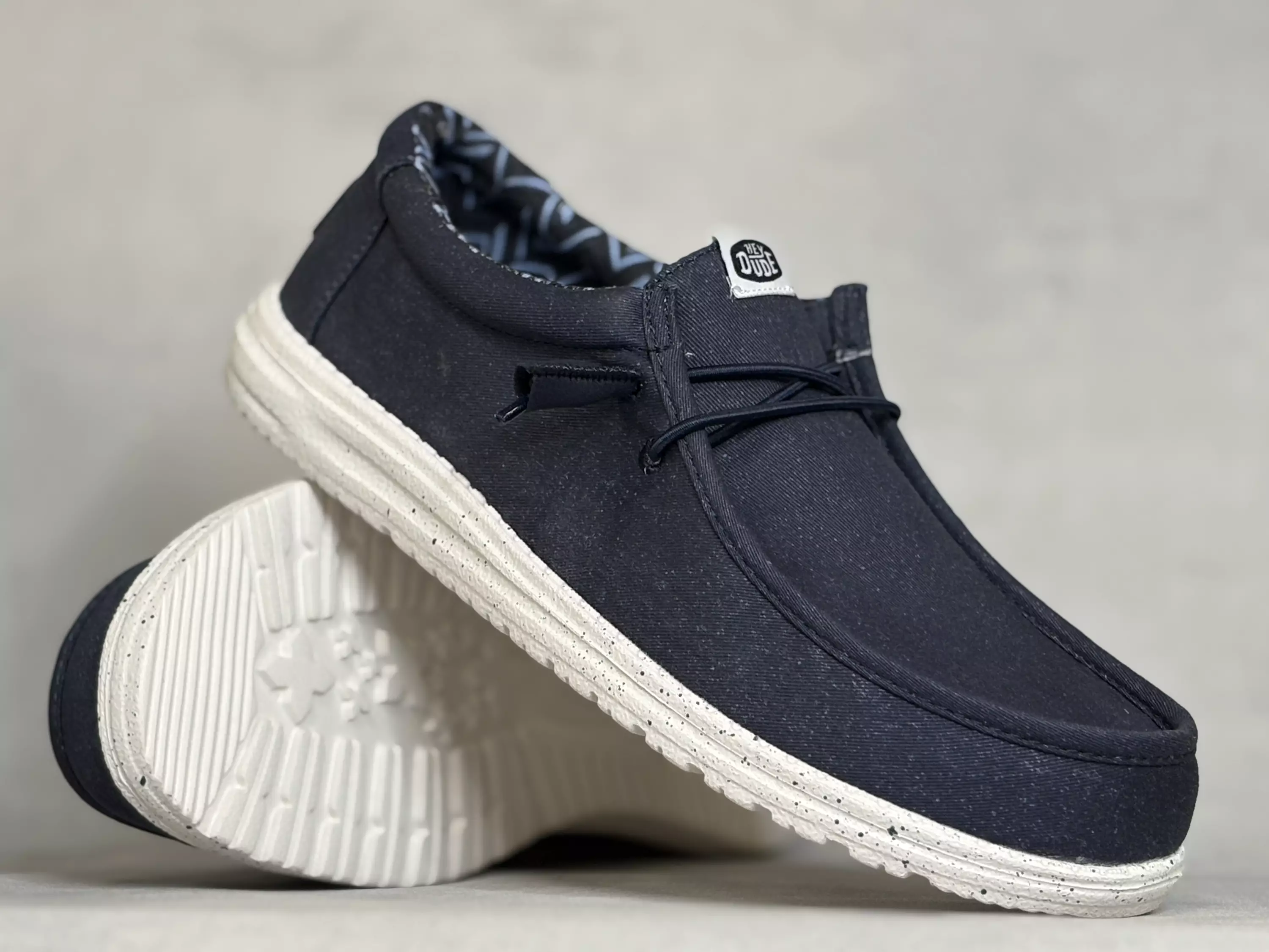 Tummansiniset miesten Hey Dude Wally Stretch Canvas Navy kangaskengät. Laivastonsininen tekstiilipinta, kevyesti joustavat kengännauhat ja valkoinen tummansinipilkullinen ulkopohja. Vaihdettavat pohjalliset, joten tarpeen vaatiessa sujautat kenkiin omaan jalkaasi parhaiten sopivat pohjalliset. Mokkasiinimallisella kengässä on varpaille hyvin tilaa. Kannan korkeus noin 3cm ja pohjan korkeus päkiän alta noin 1,5cm.
