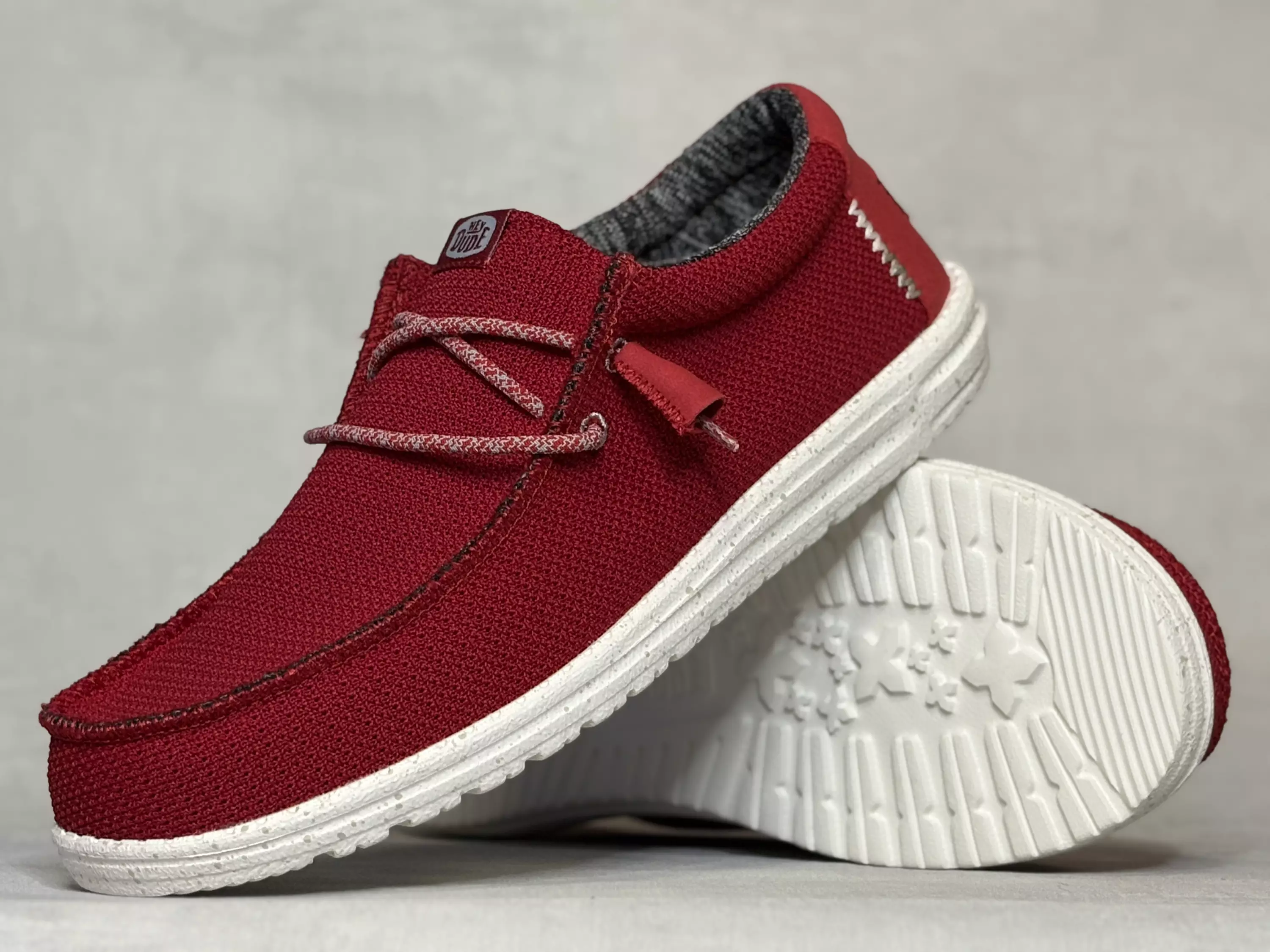 Tummanpunaiset miesten Hey Dude Wally Sport Mesh dark Red kangaskengät. Tummanpunainen tekstiilipinta, kevyesti joustavat kengännauhat ja vaalea, pilkullinen ulkopohja. Vaihdettavat pohjalliset, joten tarpeen vaatiessa sujautat kenkiin omaan jalkaasi parhaiten sopivat pohjalliset. Mokkasiinimallisella kengässä on varpaille hyvin tilaa.