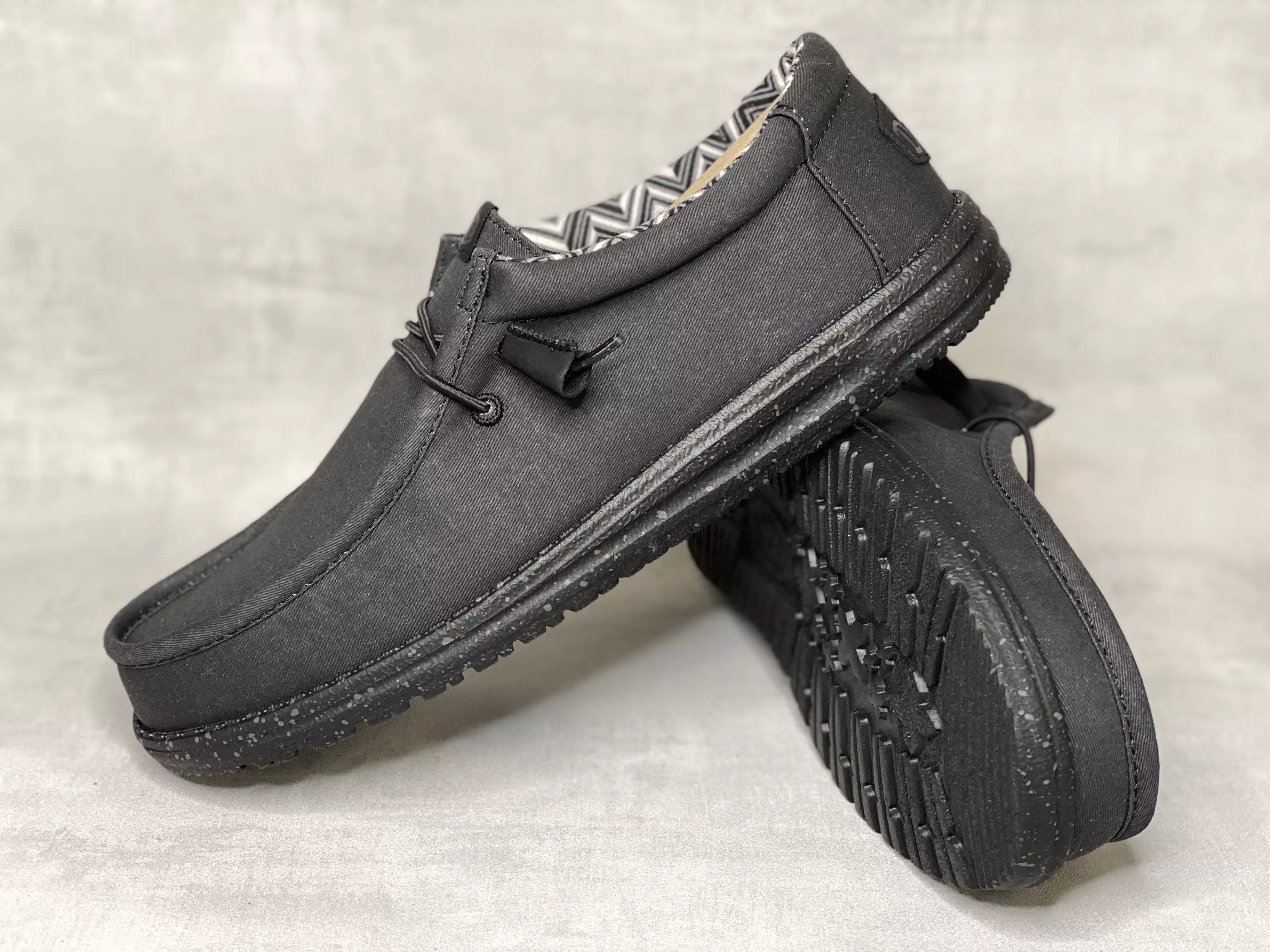 Mustat miesten Hey Dude Wally Stretch Canvas Black kangaskengät. Kokomusta tekstiilipinta, kevyesti joustavat kengännauhat ja musta harmaapilkullinen ulkopohja. Vaihdettavt pohjalliset, joten tarpeen vaatiessa sujautat kenkiin omaan jalkaasi parhaiten sopivat pohjalliset. Mokkasiinimallisella kengässä on varpaille hyvin tilaa.