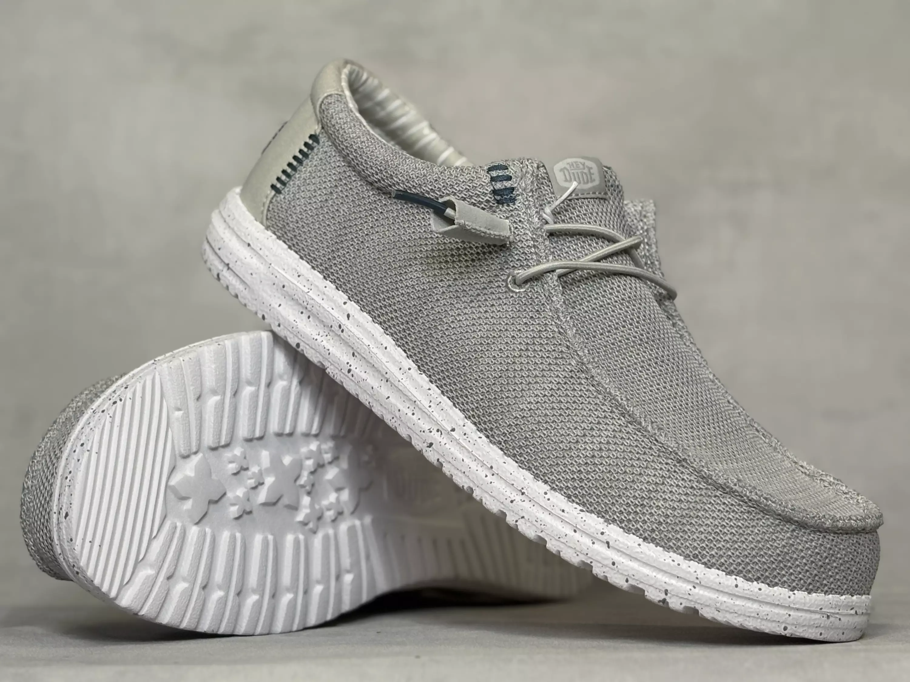 Vaaleanharmaat miesten Hey Dude Wally Stretch Sox Dawn Blue/Multi kangaskengät. Joustava tekstiilipinta, kevyesti joustavat kengännauhat ja vaalea, tummapilkullinen ulkopohja. Vaihdettavat pohjalliset, joten tarpeen vaatiessa sujautat kenkiin omaan jalkaasi parhaiten sopivat pohjalliset. Mokkasiinimallisella kengässä on varpaille hyvin tilaa.