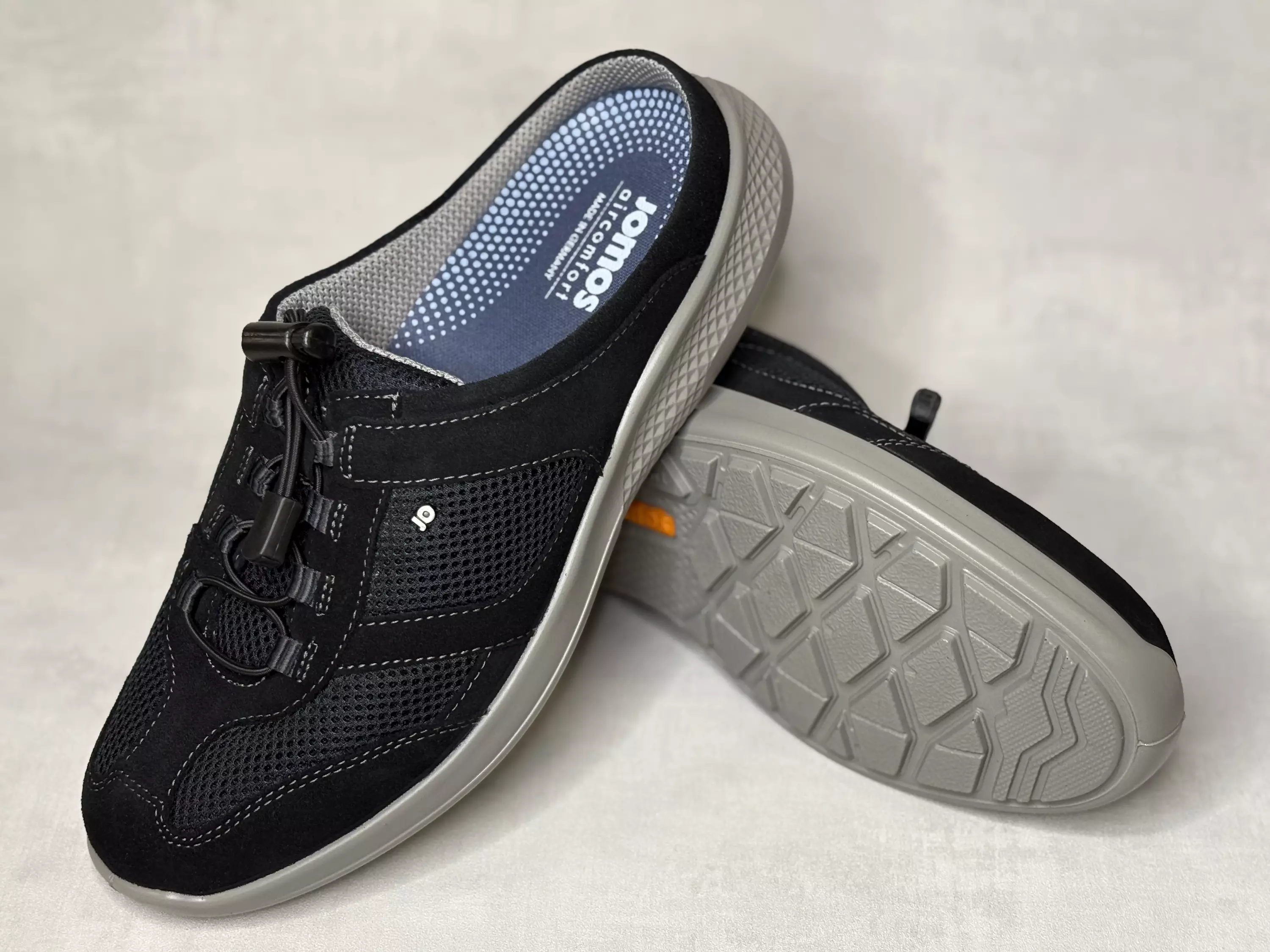 Mustat Jomos pistokkaat. Pistokkaiden pinta on yhdistelmä nahkaa ja tekstiiliä. Venykenauhat ovat säädettävissä muovisella säätöpampulalla. H-lestiset sandaalit. Pistokkaissa on vaihdettavat Jomos Aircomfort pohjalliset, joten tarvittaessa sujautat niihin omia tarpeitasi parhaiten vastaavat pohjalliset. Kannan korkeus noin 3,5cm japohjan korkeus päkiän alta noin 2cm.