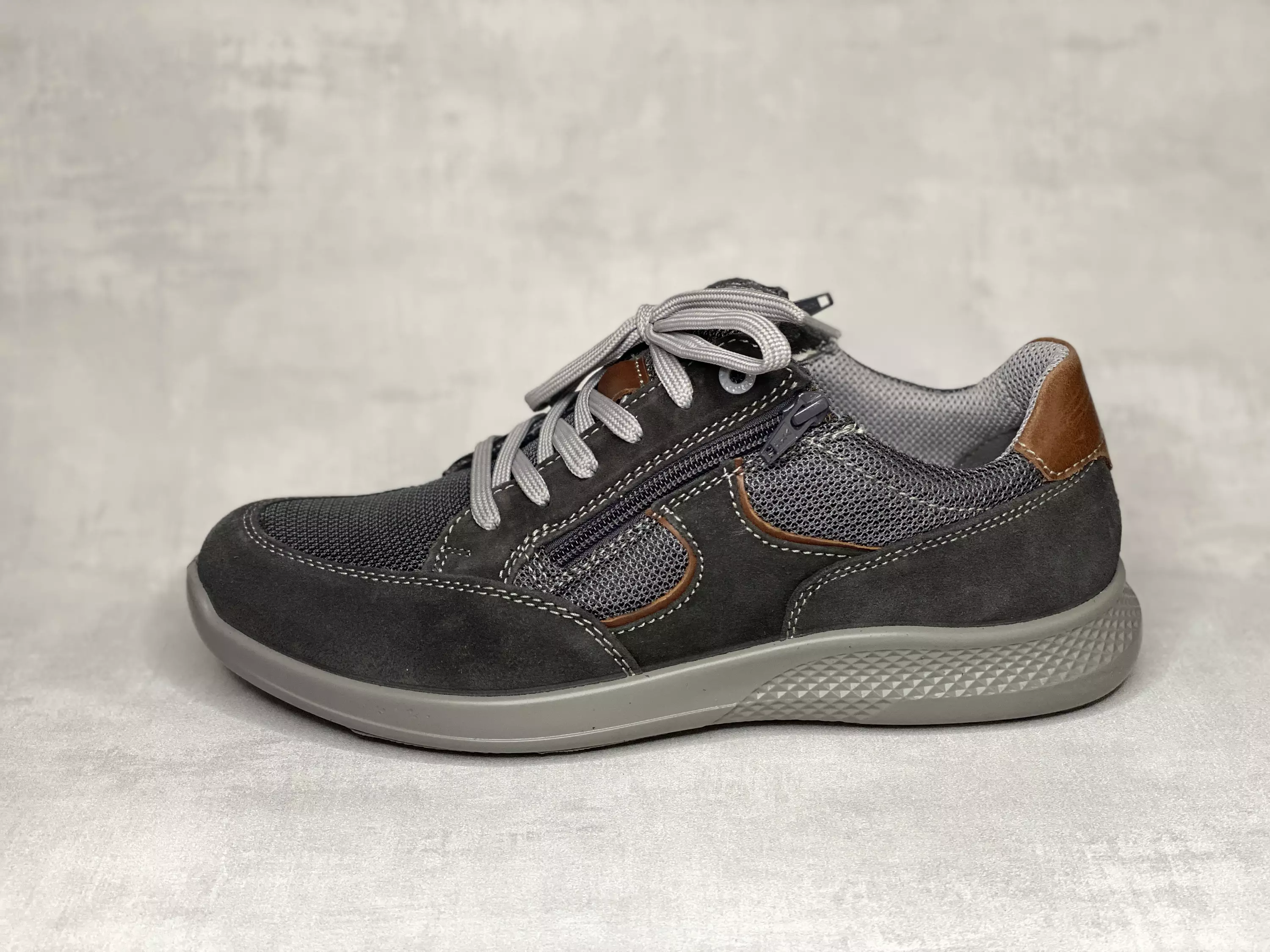 Harmaat Jomos kävelykengät. Leveät K-lestiset kävelykengät. Kengissä on nauhat ja kaksi vetoketjua. Vaihdettavat pohjalliset, joiden tilalle sujautat tarpeen vaatiessa omia tarpeitasi parhaiten vastaavat pohjalliset.