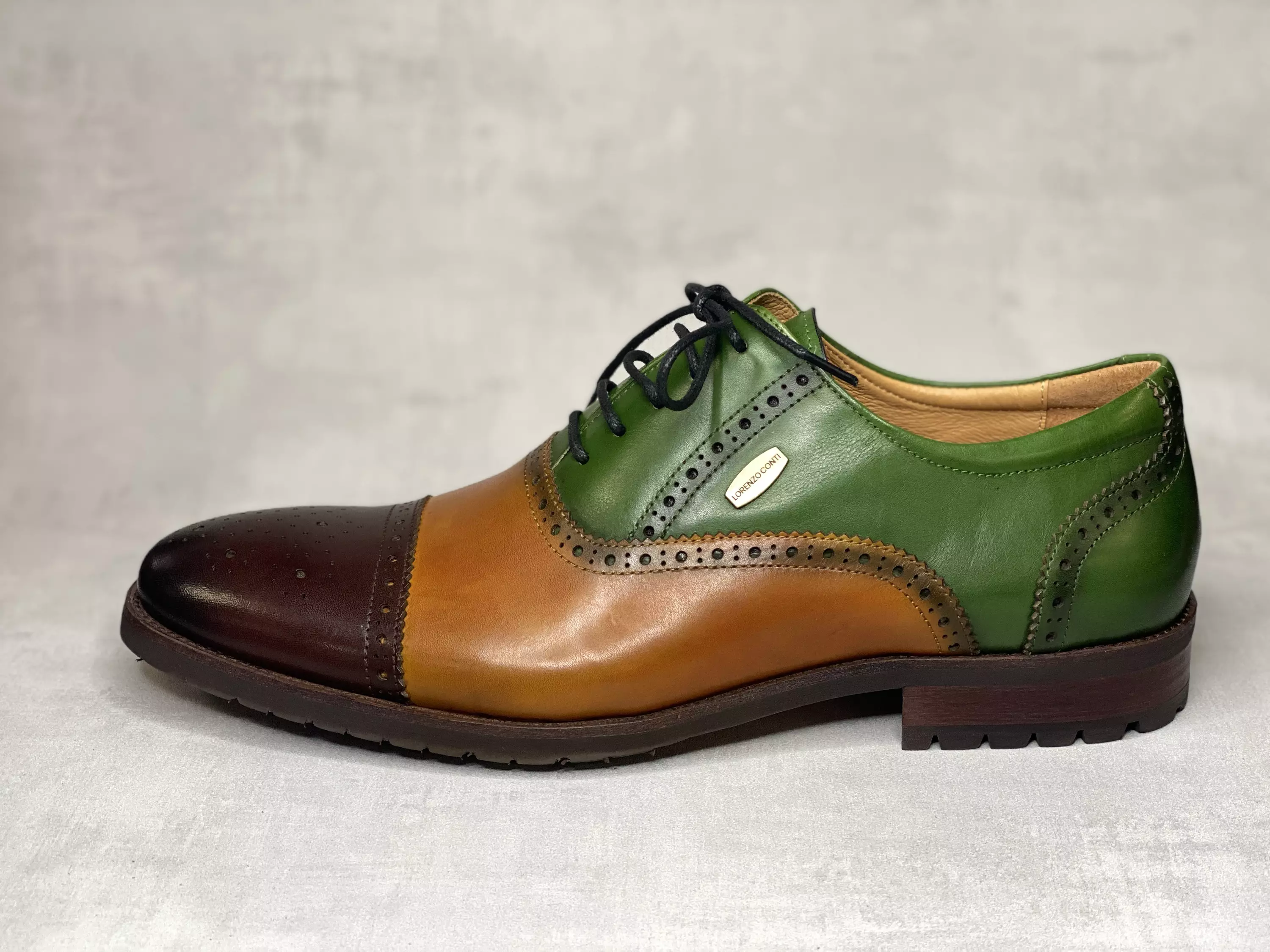 Moniväriset Lorenzo Conti by Laura Vita- Antonin Choco pukukengät. Ruskea kärki, okrankeltainen keskikappale ja vihreä kantakappale. Väreillä leikittelevät nauhalliset pukukengät, joiden kappaleiden vaihtumiskohdissa on ilmettä tuovat reikäkuvioinnit.