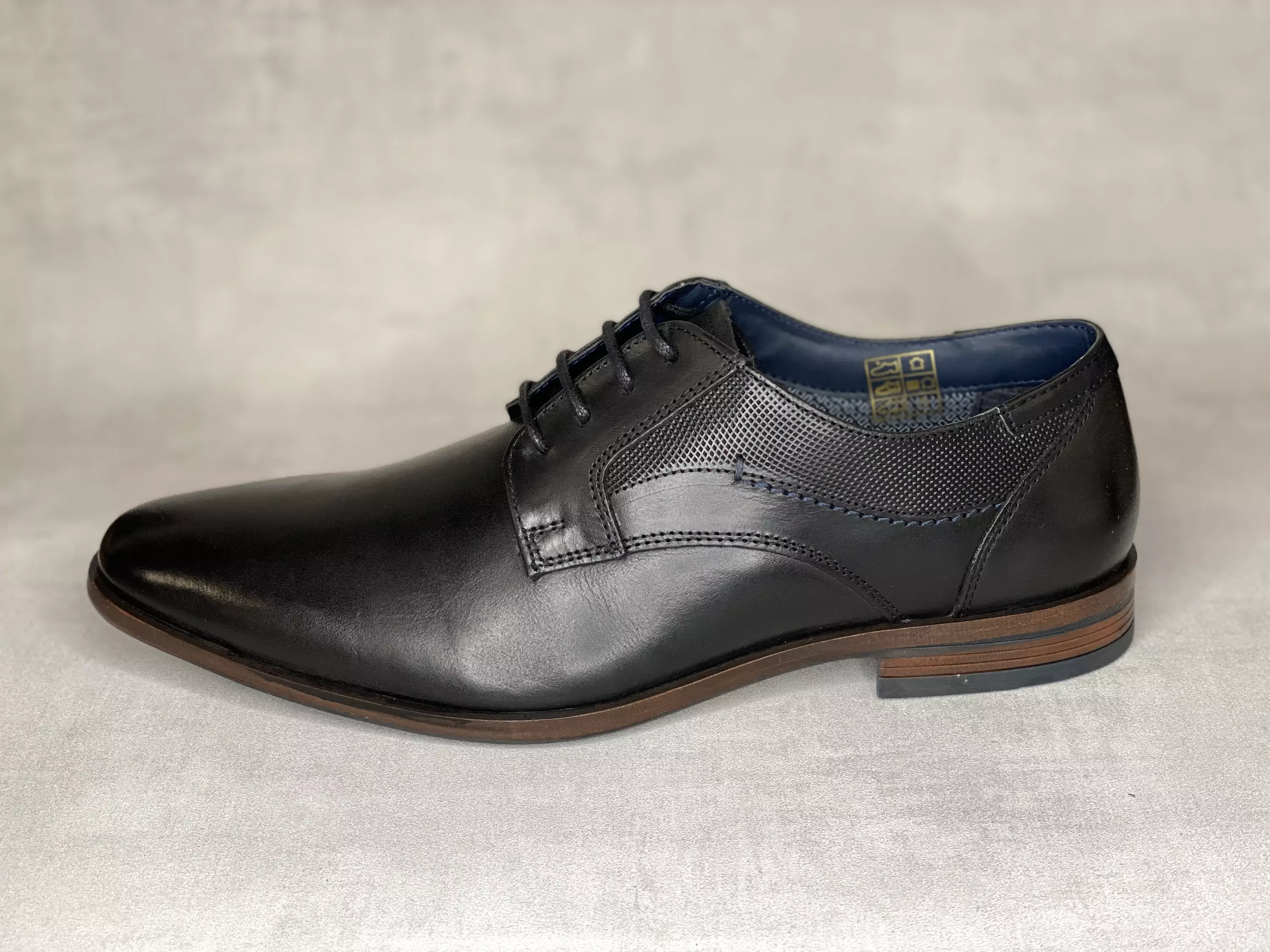 Mustat Migant pukukengät. Nauhaliiset puolikengät näyttävällä leikkauksella. Tyylikäs kapeneva kärki. Musta kenkä rytmittyy loistoonsa ruskean ulkopohjan myötä.