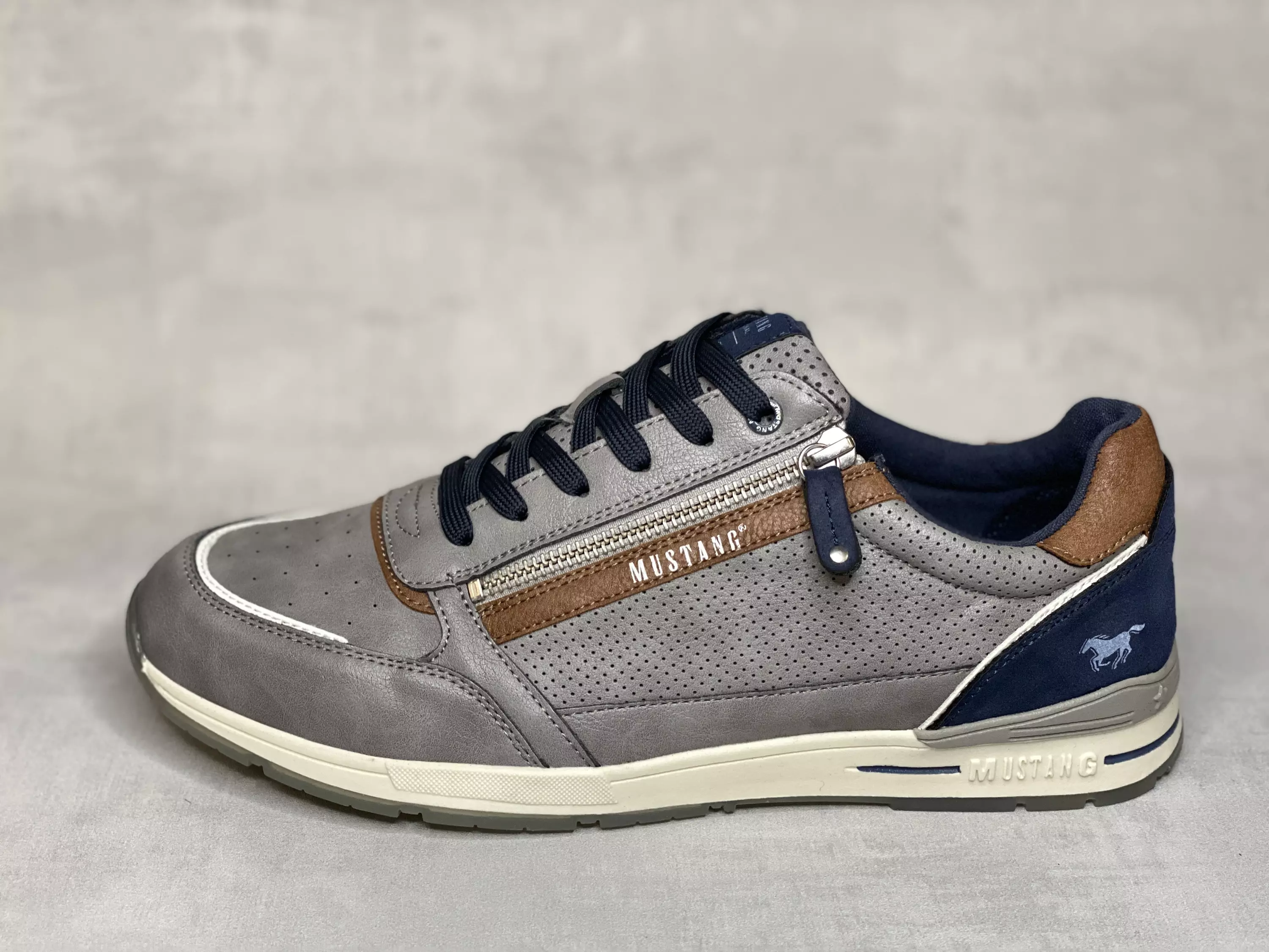 Harmaat Mustang kävelykengät. Aksenttivärinä tummansinistä ja konjakin ruskeaa, sekä hitunen valkoista. Nauhoituksen avulla kengät on helppo säätää omaan jalkaan sopiviksi. Ulkosyrjälle sijoitettu vetoketju helpottaa pukemista, mutta toimittaa myös yksityiskohdan virkaa.
