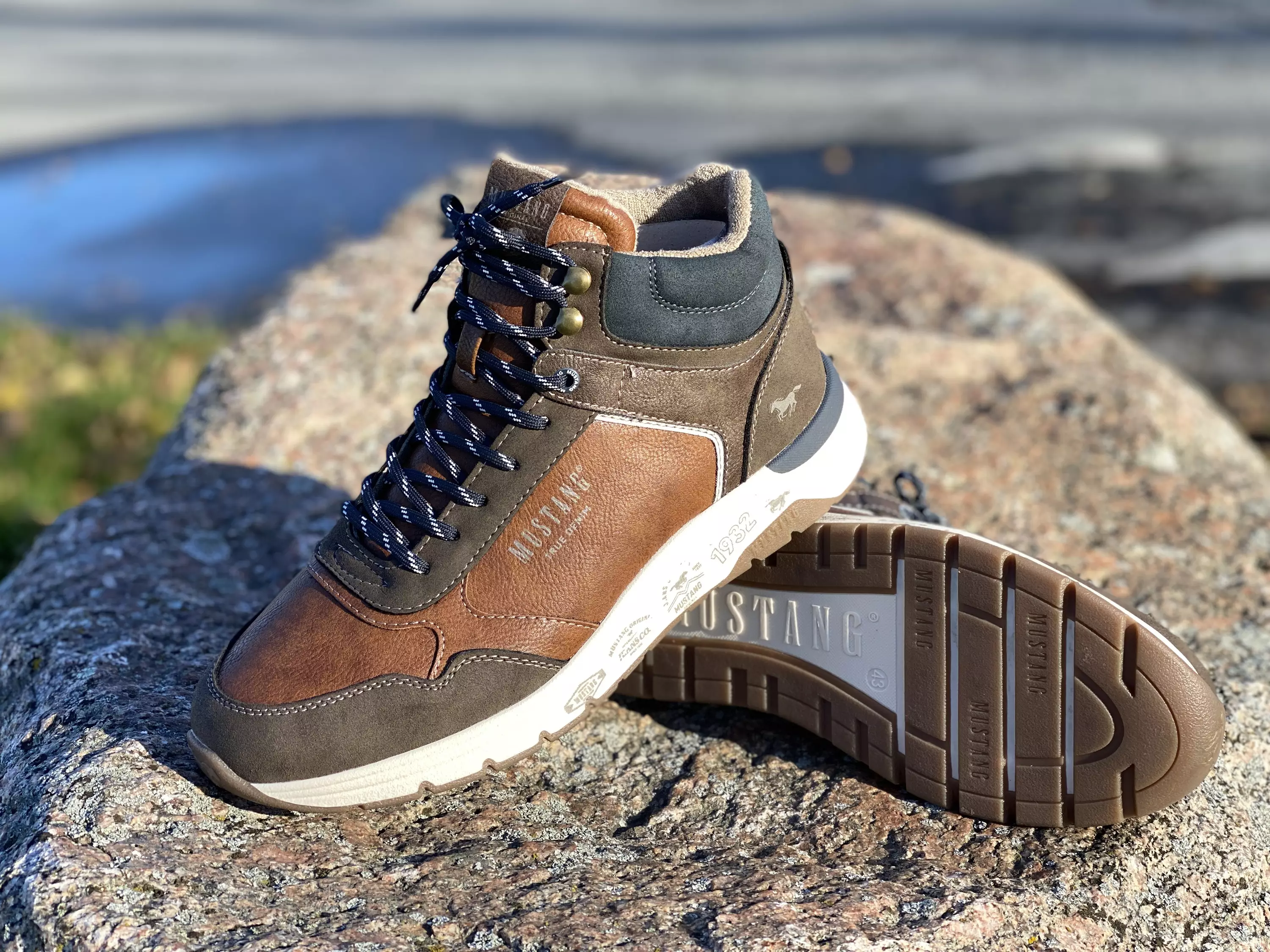 Konjakinruskeat Mustang nilkkurit. Tekstiilisellä vuorilla varustetut nilkkurit, sopivat mainiosti välikausiin! Aksenttivärinä tummansinistä ja tummaa ruskeaa, lisäksi hitunen vaaleaa harmaata ja runsaasti päälitikkauksia. Kannan korkeus noin 4cm ja pohjan korkeus päkiän alta noin 2cm.
