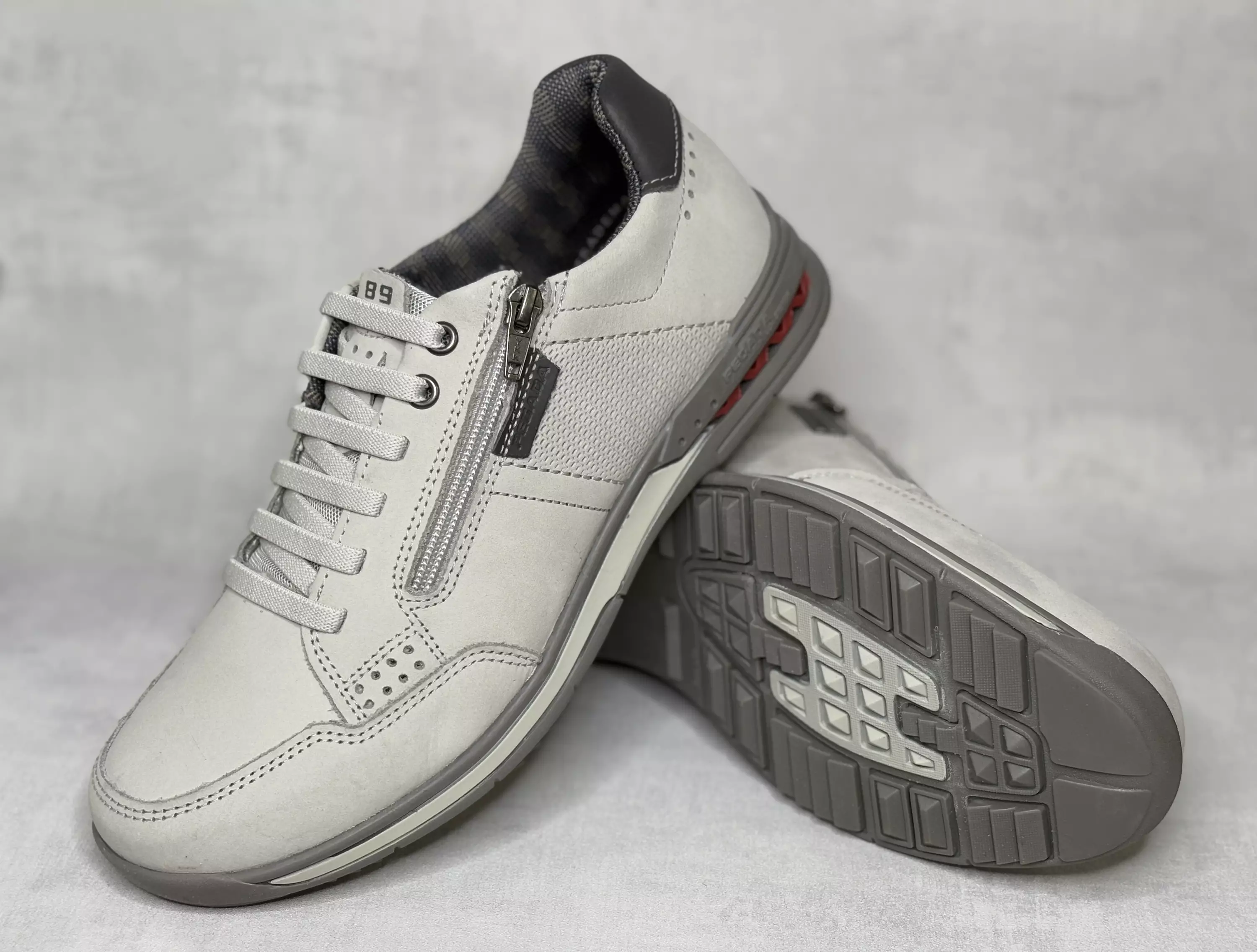 Vaaleanharmaat Pegada kävelykengät. Nupukkinahkaiset venykenauhalliset tennarit. Ulkosyrjällä pukemista helpottava vetoketju, joka toimii myös kenkien yksityiskohtana. Kengät saavat lisäilmettä pinnan leikkauksista ja pintakuvioista. Tummanharmaa aksenttiväri kantakappaleessa ja ulkosyrjän Pegada-logossa. Kannan korkeus noin 3cm ja pohjan korkeus päkiän alta noin 1,5cm.