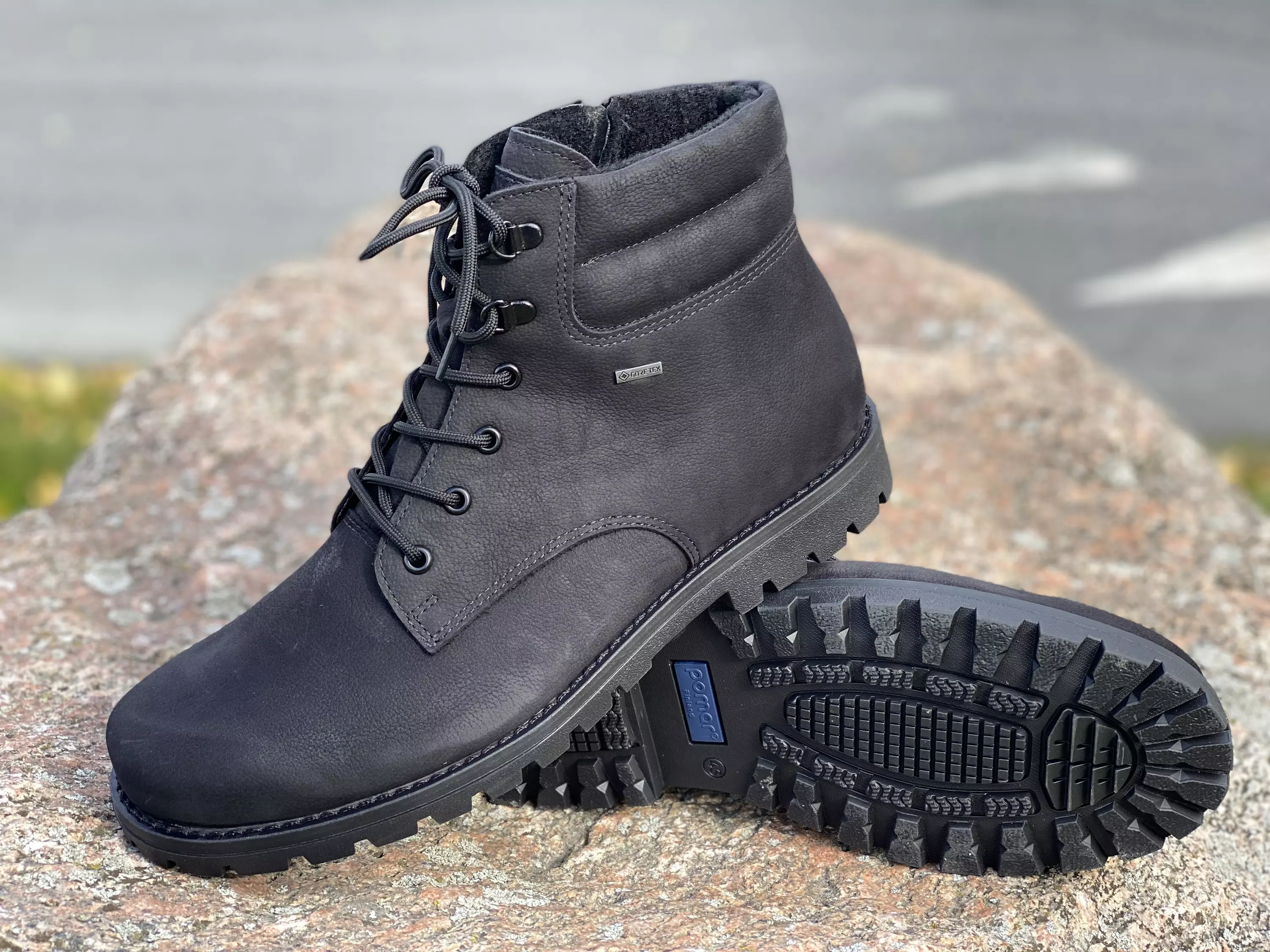 Mustat Pomar OLOS nilkkurit. Huopavuoriset nupukkinahkaiset nilkkurit on varustettu Gore-Tex kalvolla! Ei vaivaa märät olosuhteet, eivätkä myöskään tuuliset. Sisäsyrjällä pukemista vauhdittava vetoketju ja nauhojen avulla nilkkurit on helppo säätää omaan jalkaan sopiviksi. Vaihdettavat huopapintaiset pohjalliset, joten tarvittaessa sujautat kenkiin omia tarpeitasi parhaiten vastaavat pohjalliset. Kannan korkeus noin 3cm ja pohjan korkeus päkiän alta noin 2cm.