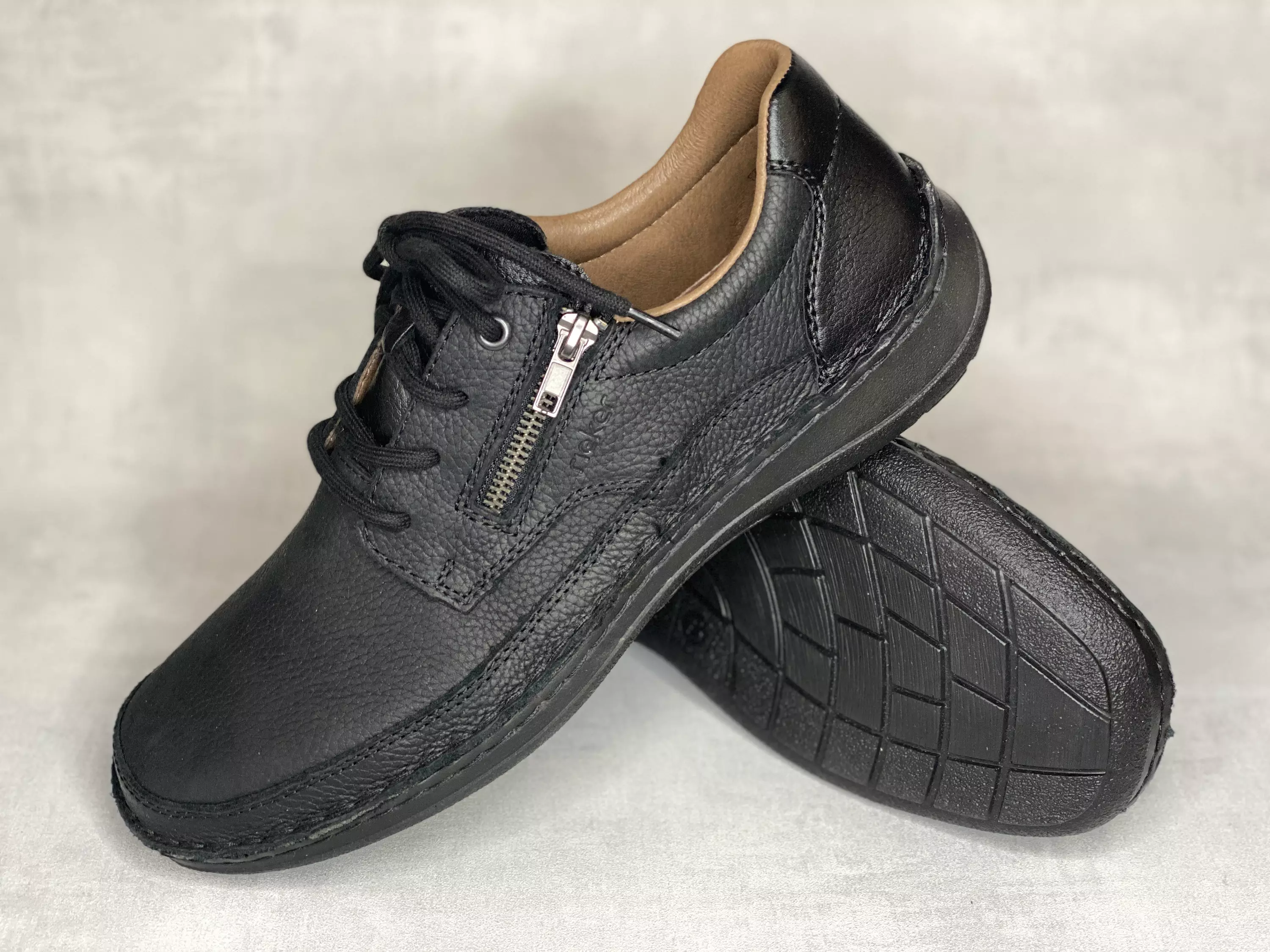 Mustat Rieker kävelykengät. Miesten leveälestiset kävelykengät. Nauhoilla ja kenkien ulkosyrjälle sijoitetulla vetoketjulla varustetut matalavartiset tennarit. Mokkasiinimallisessa kärjessä on varpaille hyvin tilaa. Kannan korkeus noin 3cm.