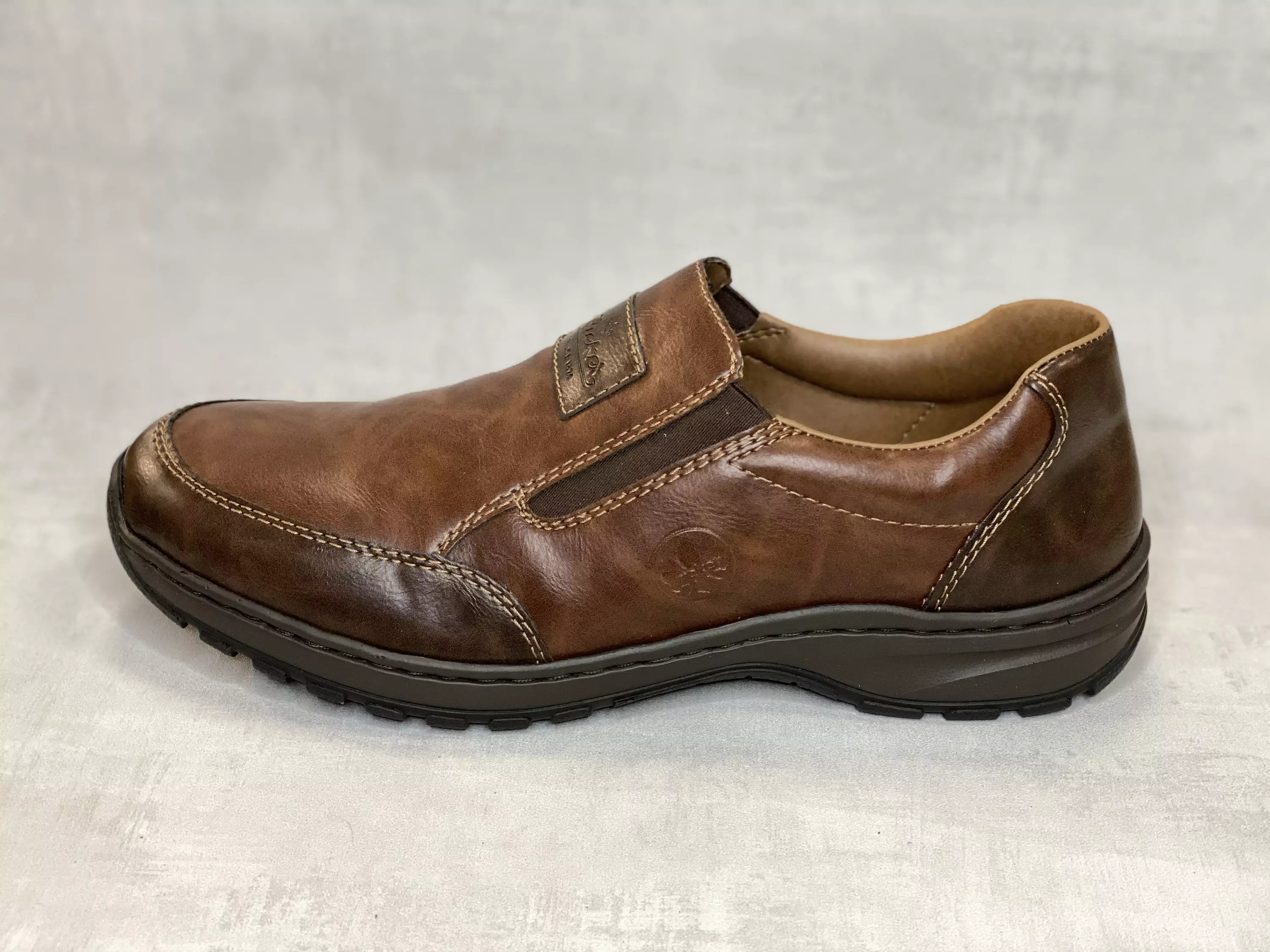 Ruskeat leveäslestiset Rieker kävelykengät. Vaihdettavan pohjallisen tilalle sujahtaa vaivattomasti omaan jalkaasi parhaiten sopiva pohjallinen. Sisä- ja ulkosyrjällä pukemista helpottavat ja istuvuutta parantavat venykkeet.