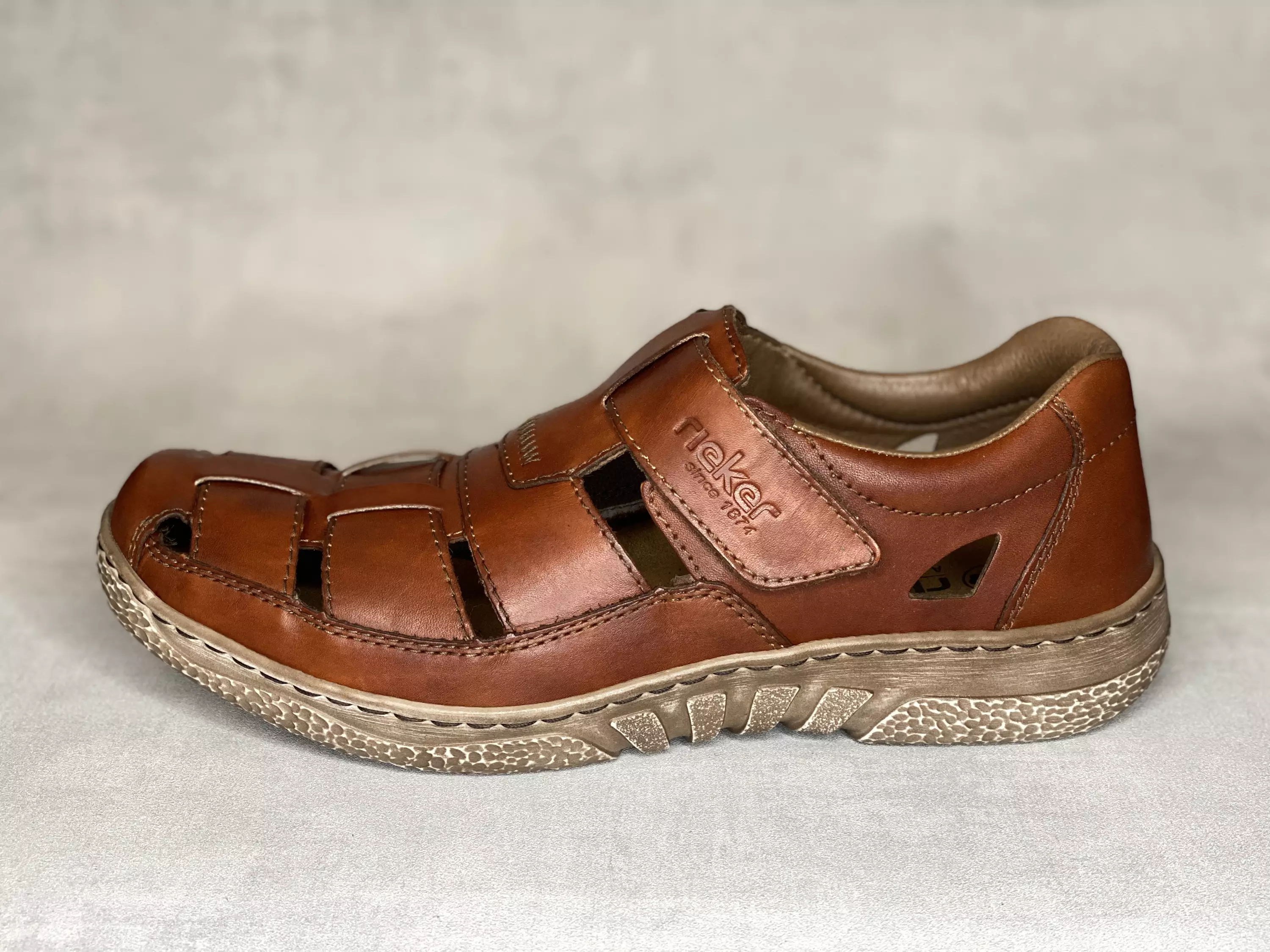 Konjakinruskeat Rieker kävelykengät. Leveälestiset nahkaiset kävelykengät, joissa tarrallinen säätöremmi. Kengän remmien väliin jää tyhjää tilaa, joten jalat ovat hyvin ilmastoidut kesän lämmöissä. Vaihdettavat pohjalliset, eli tarpeen vaatiessa sujautat kenkiin jalkojesi tarpeita parhaiten vastaavat pohjalliset.