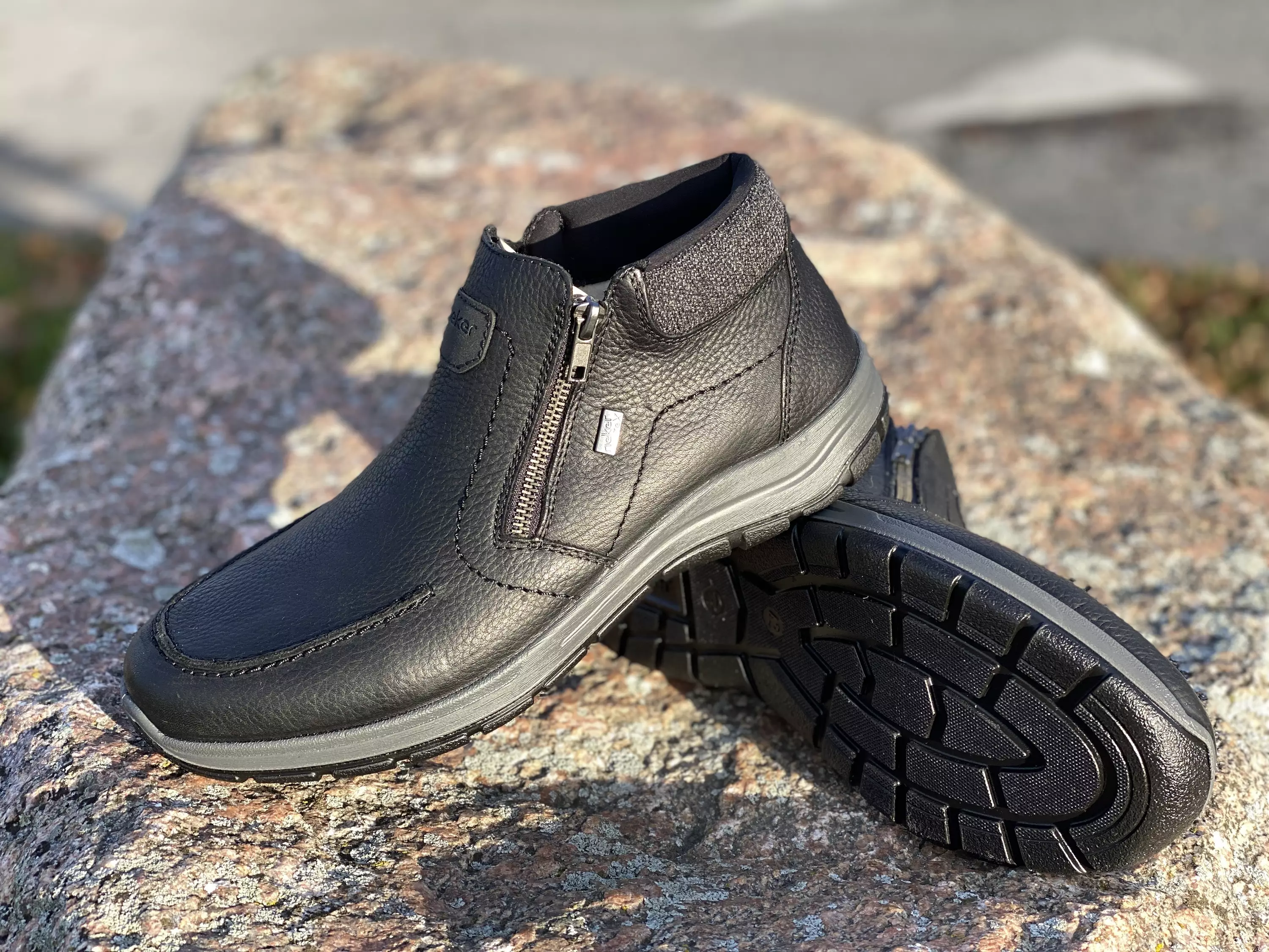 Mustat Rieker talvikengät. Pörröisellä vuorilla varustetut talvikengät. Varren suussa harmaa tekstiilinen somiste. Vetoketju löytyy kengän sisä- ja ulkosyrjältä. Vaihdettavat huopapintaiset pohjalliset. RiekerTex kalvo pitää tuulen ja tuiskeen sekä kosteuden kengän ulkopuolella. Kannan korkeus noin 3cm ja pohjan korkeus päkiän alta noin 1,5cm.