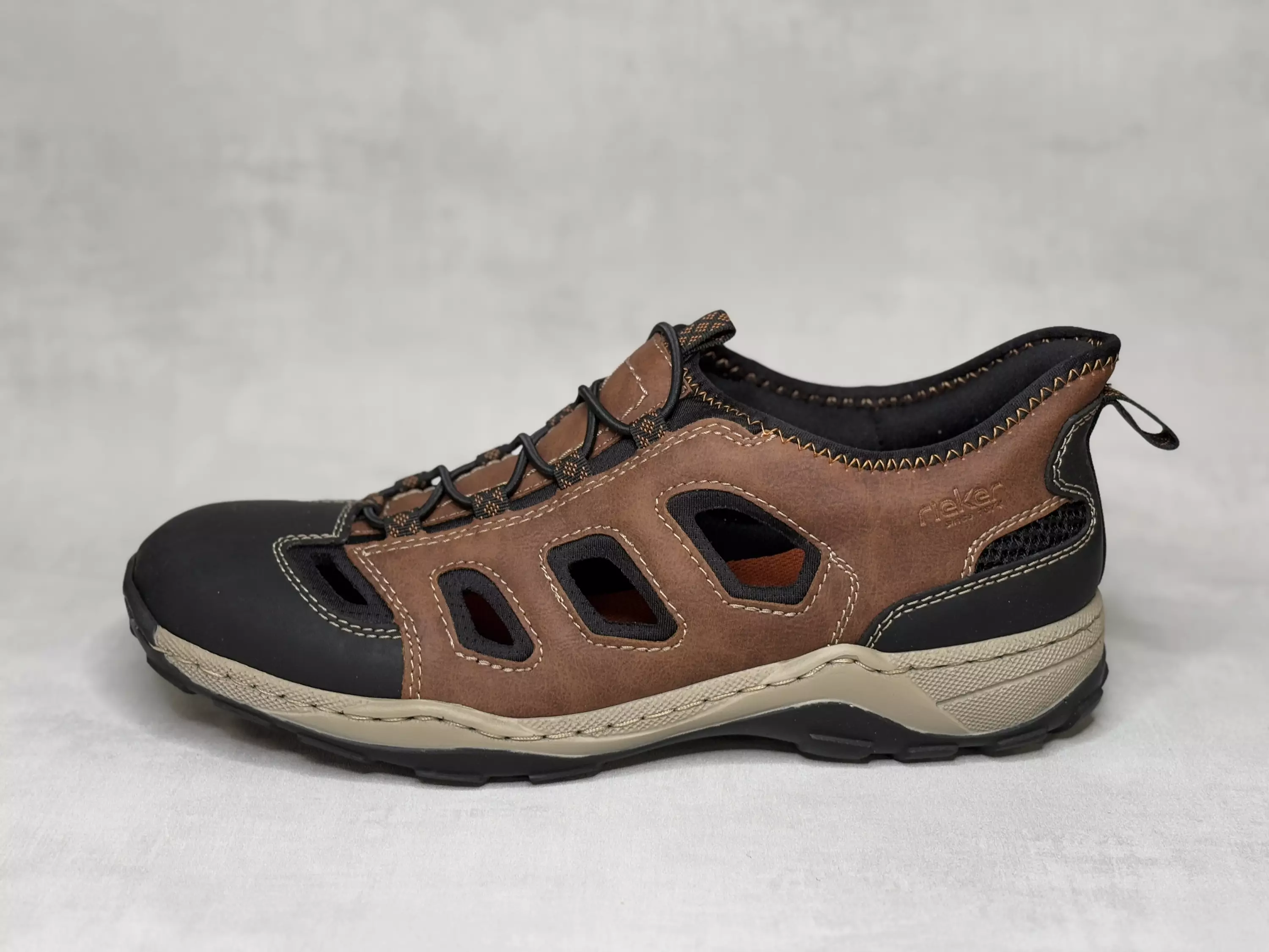 Ruskeat reikäkuvioidut Rieker kävelykengät. Ready2Go kenkälusikkakanta. Aksenttivärinä mustaa, vaaleaa ruskeaa ja ripaus murrettua oranssia. Koristeena mustat venykenauhat, eivät ole siis säädettävissä.