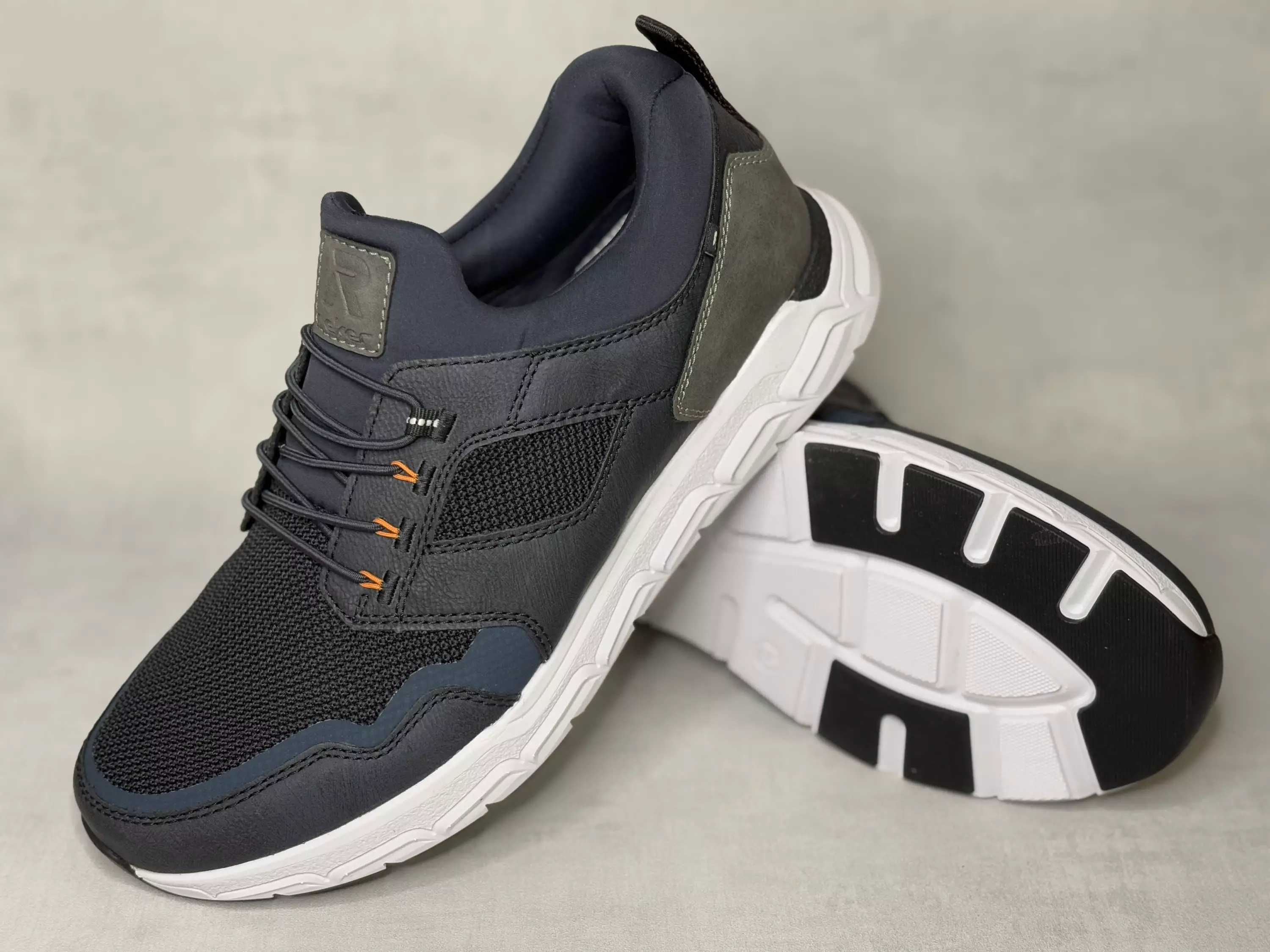 Tummansiniset Rieker lenkkarit. Harmaa kantakappale ja iltissä harmaa Rieker-merkki. Koristeena joustavat venykenauhat. Nauhakujissa aksenttivärinä hitunen oranssia. Kannassa musta vetolenkki. Rieker soft-pohjalliset ovat vaihdettavat, joten tarvittaessa sujautat kenkiin omia tarpeitasi parhaiten vastaavat pohjalliset. Kannan korkeus noin 3,5cm ja pohjan korkeus päkiän alta noin 2cm.