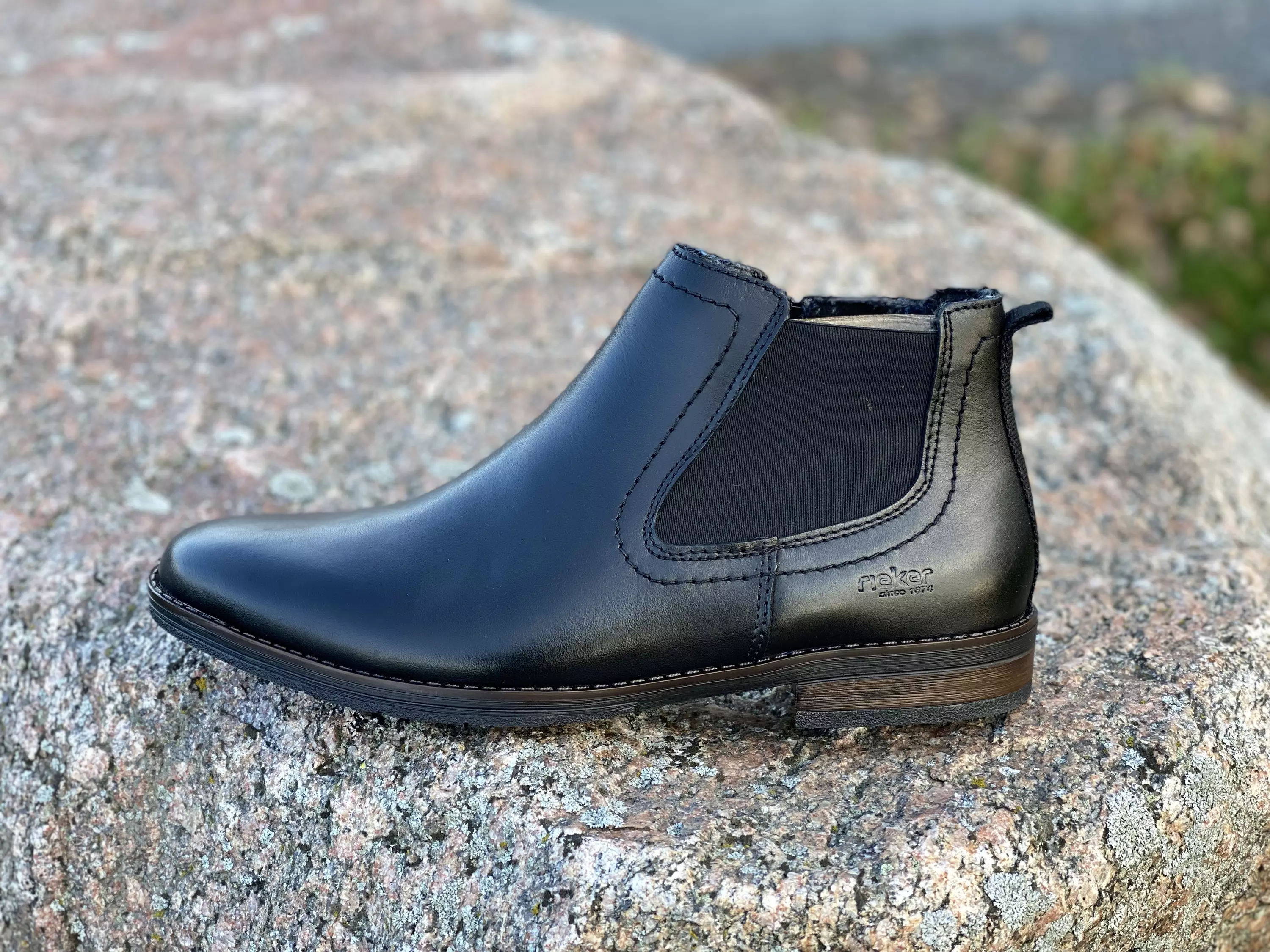 Mustat Rieker nilkkurit. Tyylikkäät venykkeellä ja vetoketjulla varustetut nahkanilkkurit, joissa on tekstiilinen vuori. Hieman kapeneva kärki. Nilkkureissa on kiinteä huopapintainen pohjallinen. Kengän takaosassa on tekstiilikaistale, josta muotoutuu pieni vetolenkki kengän yläreunaan.