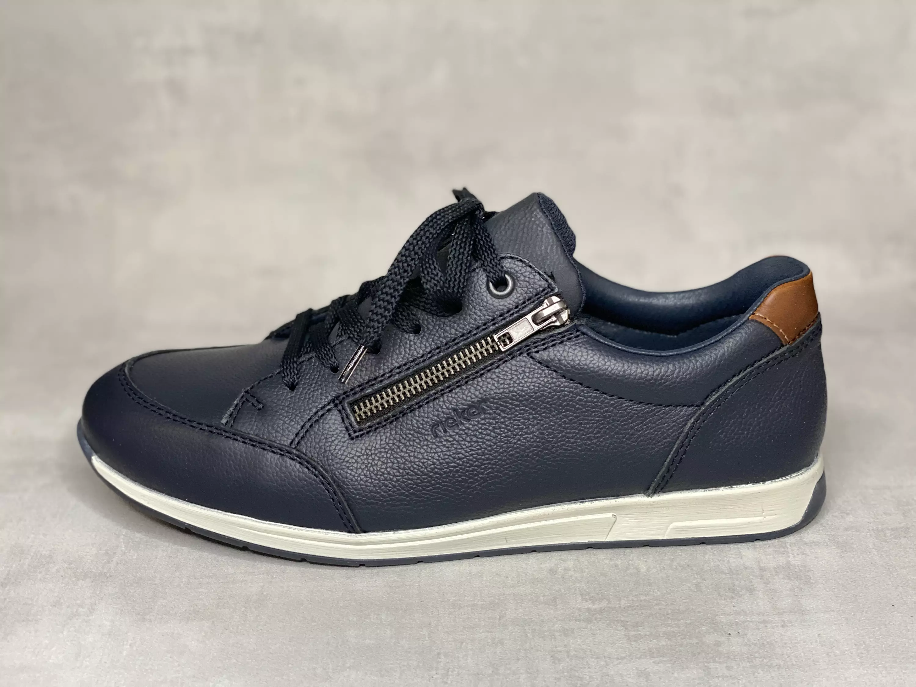 Tummansiniset Rieker kävelykengät. Nauhaoilla ja ulkosyrjälle sijoitetulla pukemista helpottavalla vetoketjulla varustetut kävelykengät. Kantakappaleen yläreunassa aksenttivärinä konjakinruskeaa. Vaihdettavat Rieker antistress pohjalliset, joiden tilalle sujautat tarvittaessa vaivattomasi omaan jalkaasi parhaiten sopivat pohjalliset.