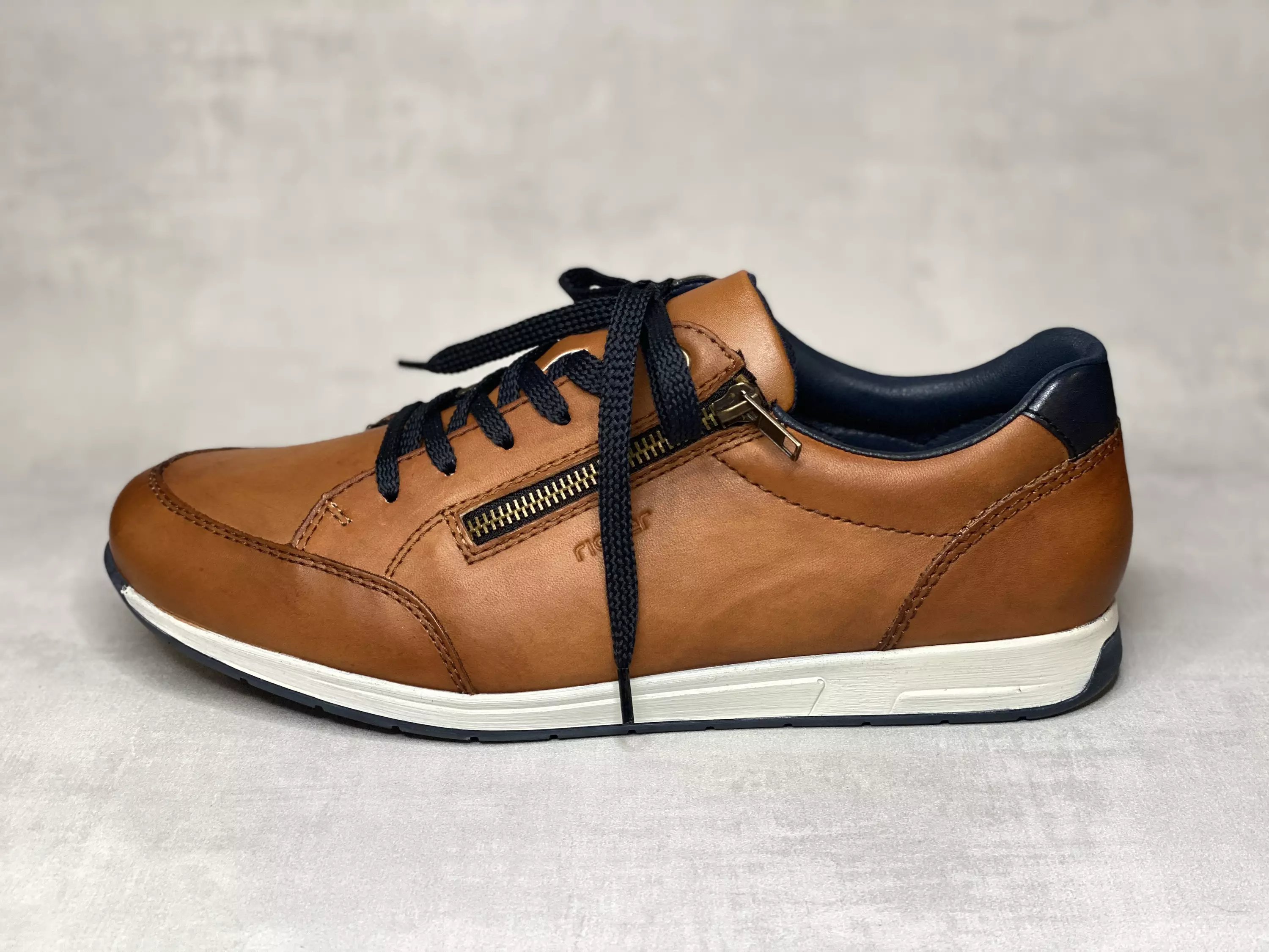 Konjakinruskeat Rieker kävelykengät. Nahkaiset matalavartiset kävelykengät tummansinisillä yksityiskohdilla. Ulkosyrjällä pukemista helpottava vetoketju. Nauhoituksen avulla kengät on helppo säätää omaan jalkaan sopiviksi. Kengät kapenevat hieman kärkeä kohti.