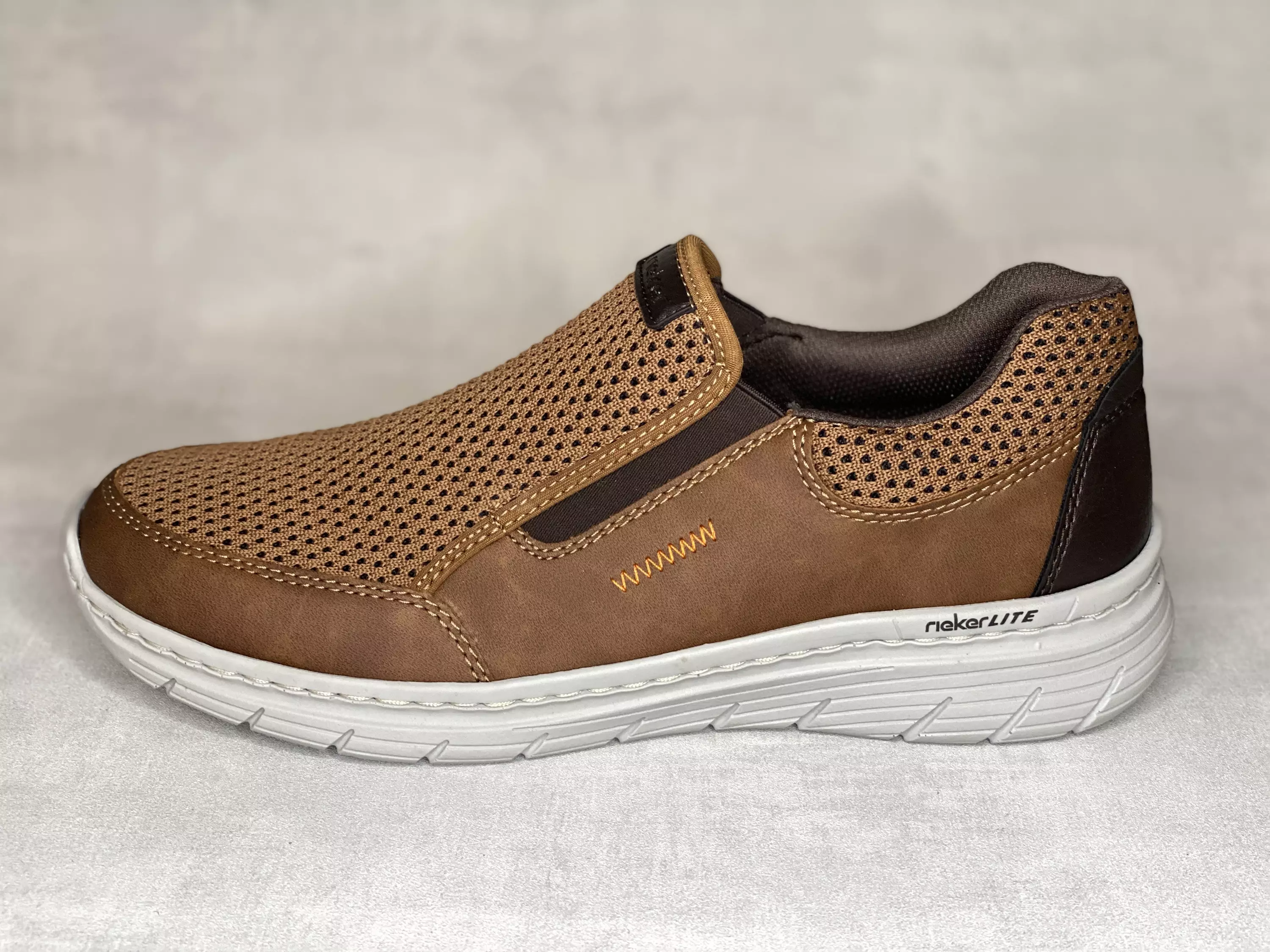 Ruskeat Rieker kävelykengät. Kahdella tummanruskealla venykkeellä varustetut kävelykengät, joiden pinnassa yhdistyy tekstiili ja synteettinen materiaali. Tummanruskea kantakappale ja ulkosyrjän oranssi siksak-tikkaus antavat kengälle lisäilmettä. Pehmeät Rieker antistress-pohjalliset.