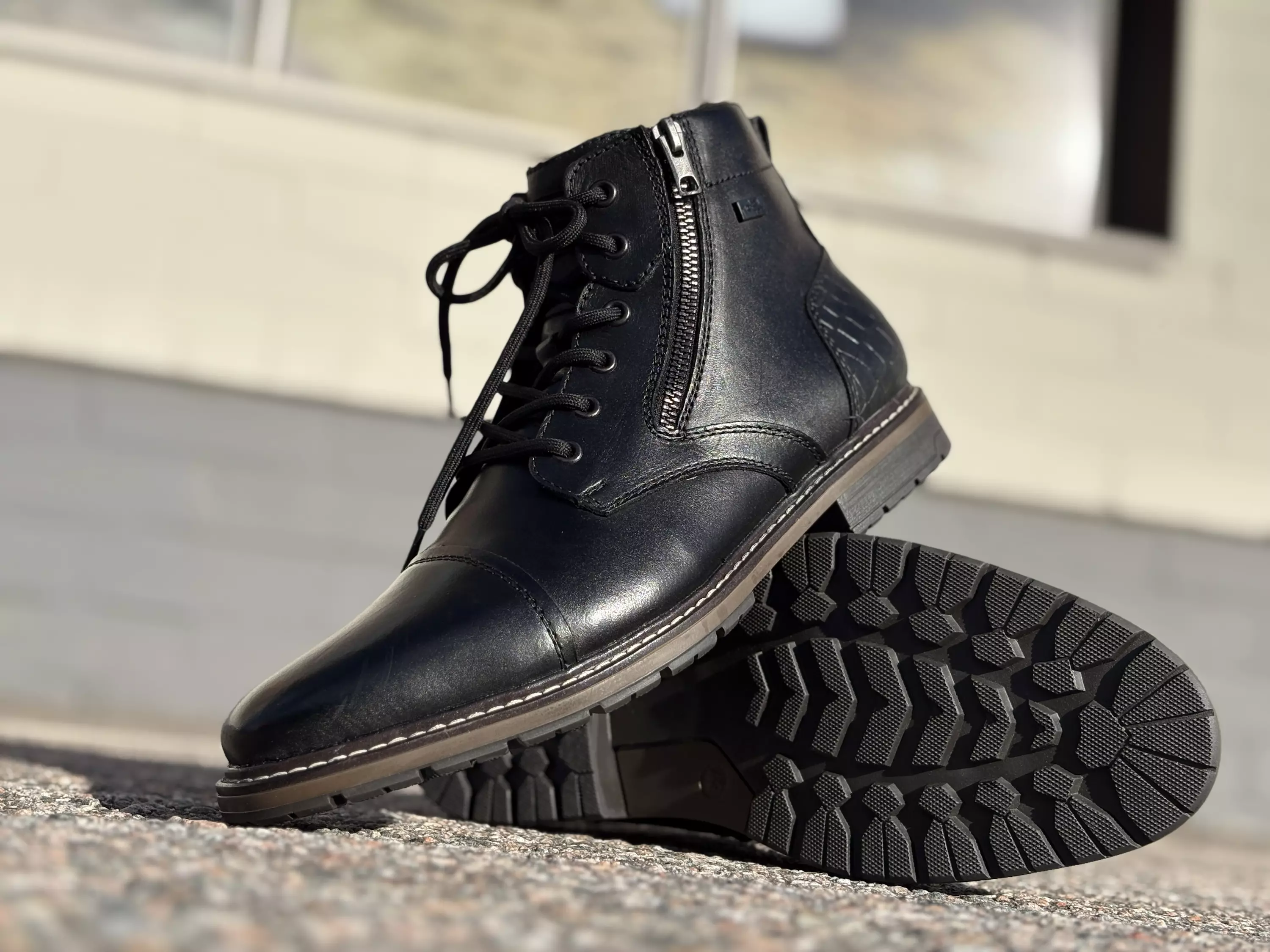 Mustat nahkaiset Rieker nilkkurit. Klassiset mustat nilkkurit, joiden kannassa yksityiskohtana suomukuvioinen kappale. Tyylikäs kapeneva kärki. Nauhojen avulla kengät on helppo säätää omaan jalkaan sopivan kireälle. Sisä- ja ulkosyrjälle sijoitetut vetoketjut nopeutavat pukemista. RiekerTex pitää tuulen tuiskeen ja veden kenkien ulkopuolella. Reddytekstiilinen pörröinen vuori. Lestimitoitus G½, eli kengät ovat hitusen normaalia leveämmät. Kannan korkeus noin 3cm ja pohjan korkeus päkiän alta noin 1,5cm.