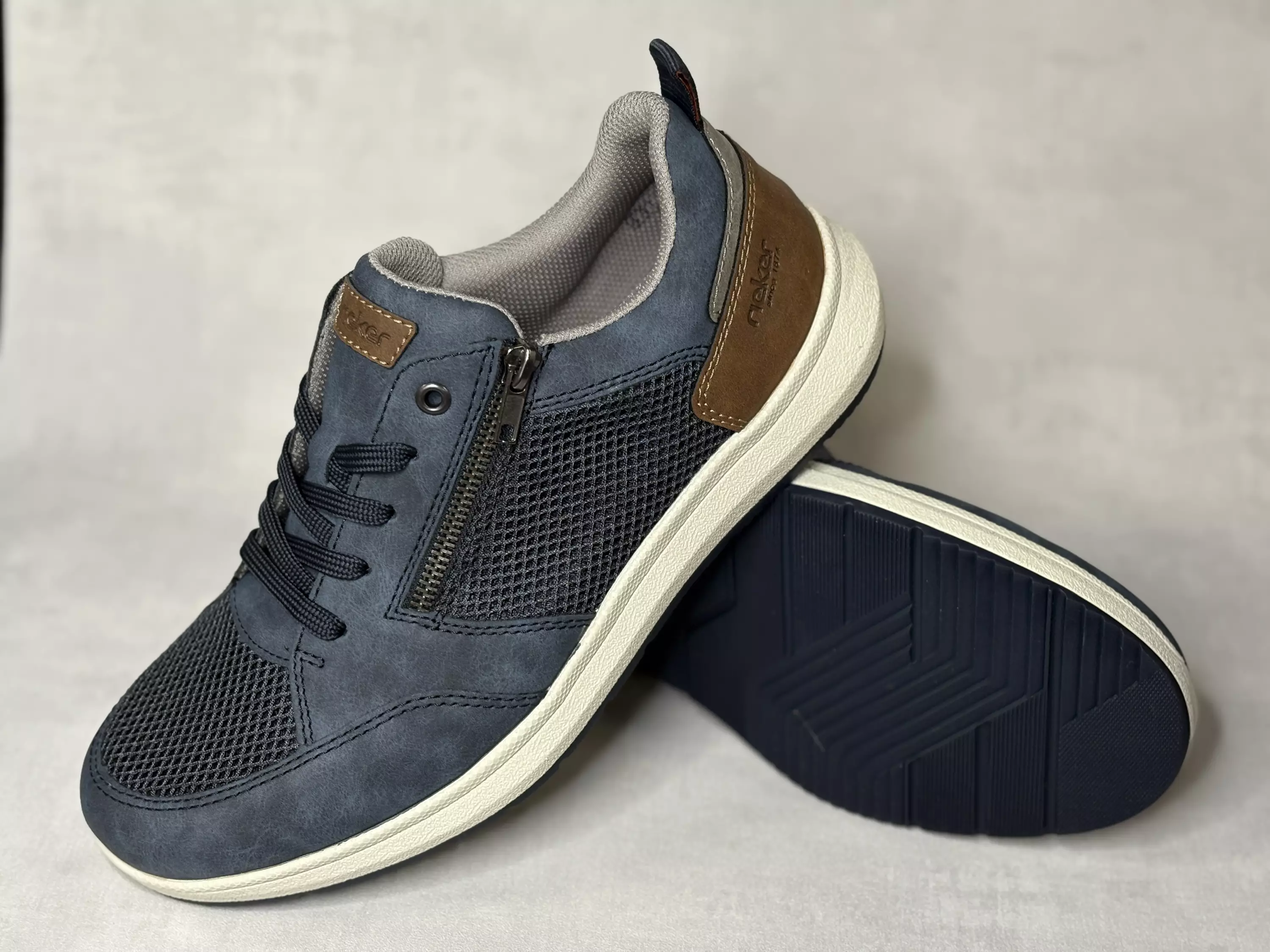 Siniset Rieker kävelykengät. Nauhalliset kengät on helppo säätää omaan jalkaan sopiviksi. Ulkosyrjälle sijoitettu vetoketju helpottaa pukemista, toimien myös kengän yksityiskohtana. Leveälestiset (Rieker Extra wide) kävelykengät on varustettu vaihdettavilla Rieker antistress-pohjallisilla. Vaihdettavat pohjalliset mahdollistavat omaan jalkaan parhaiten sopivien pohjallisten käyttämisen. Kannan korkeus noin 3cm ja pohjan korkeus päkiän alta noin 2cm.