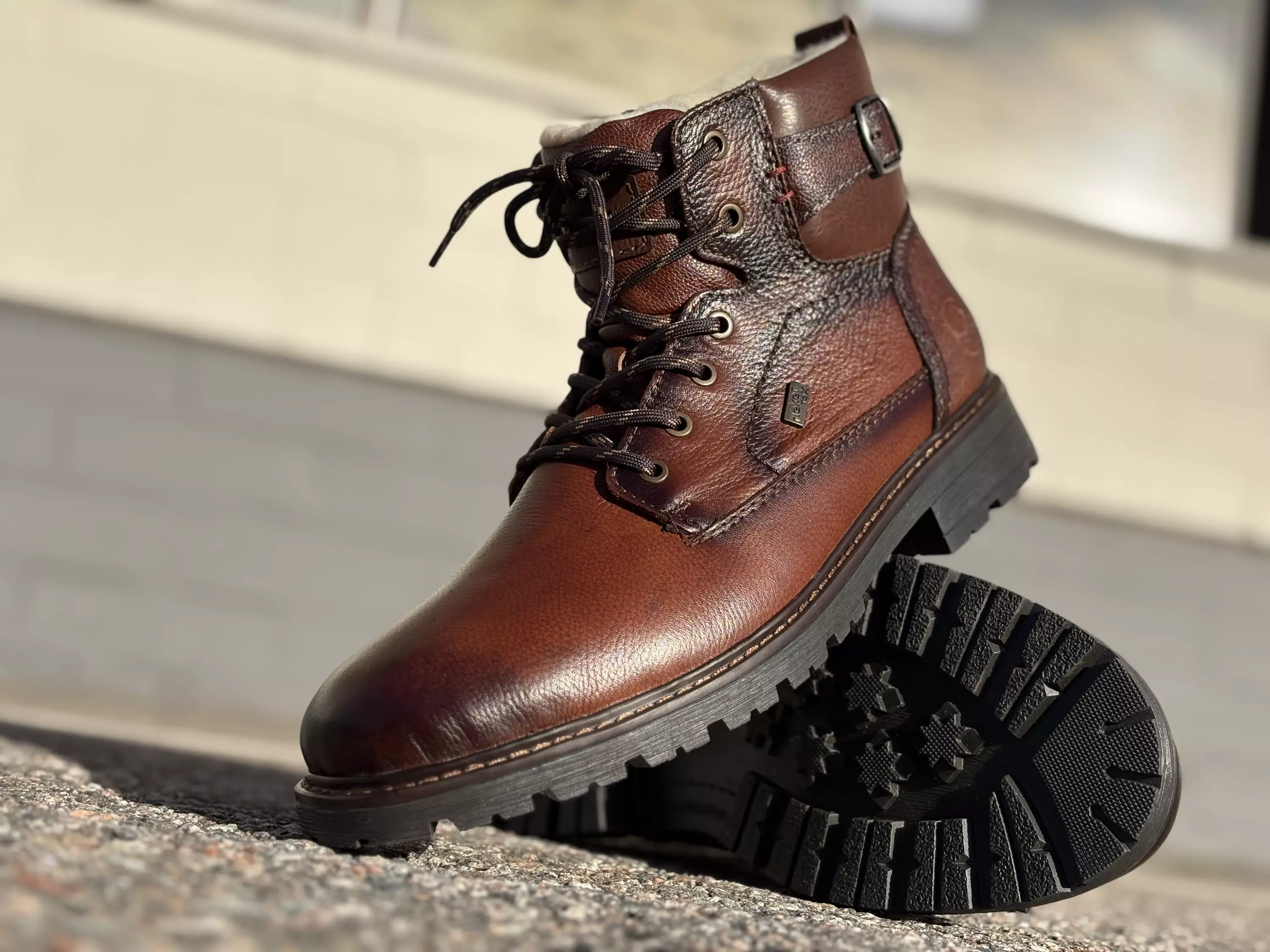 Ruskeat Rieker talvinilkkurit. Pörröisellä villavuorilla varustetut nilkkurit. Nauhojen avulla säädät kengät omaan jalkaasi sopivan kireälle ja sisäsyrjälle sijoitettu vetoketju nopeuttaa pukemista. Ulkosyrjällä yksityiskohtana lyhyt remmi, jossa metallinen koristesolki. Tummempi kärki ja tummennetut tikkauksen ympäristö antavat nilkkureille lisäilmettä. RiekerTex pitää kosteuden ja tuulentuiskeen kenkien ulkopuolella, auttaen jalkoja pysymään lämpiminä. Normaalia hiukan leveämpi G½ lesti. Kannan korkeus noin 3,5cm ja pohjan korkeus päkiän alta noin 1,5cm.