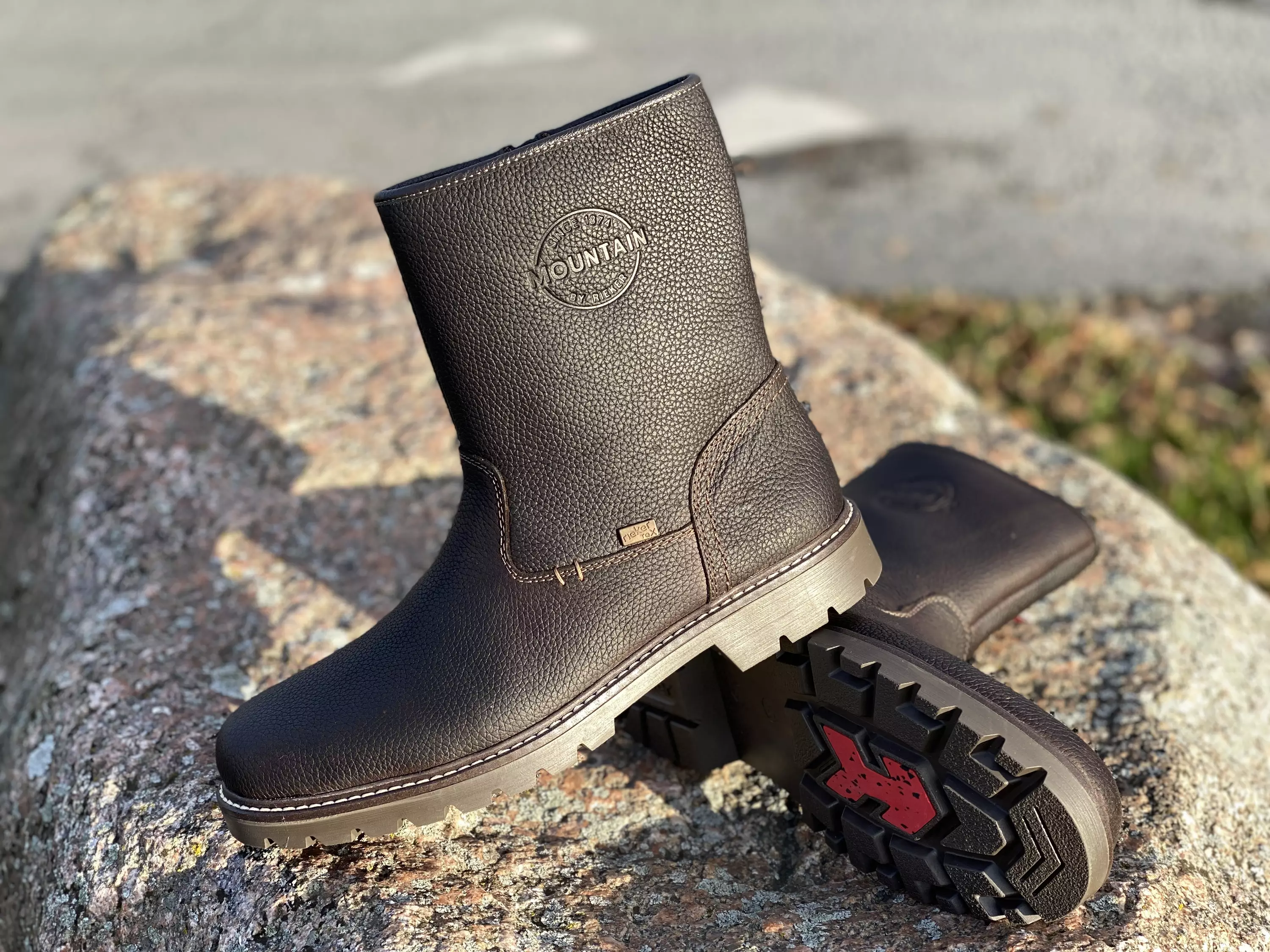 Tummanruskeat Rieker talvisaappaat. Villavuoriset talvisaappaat on varusettu RiekerTex kalvolla, jonka turvin jalat pysyvät kuivina talven tuiskeissa. Nämä talvisaappaat saavat ilmettä pinnan harkituista leikkauksista sekä varren yläreunaan sijoitetusta kohokuvioisesta Since 1874 Mountain by Rieker-merkistä. Ulkopohjassa on päkiän alla kitkapintainen osio. Sisäsyrjällä pukemista helpottava vetoketju. Kannan korkeus noin 3cm ja pohjan korkeus päkiän alta noin 2cm.