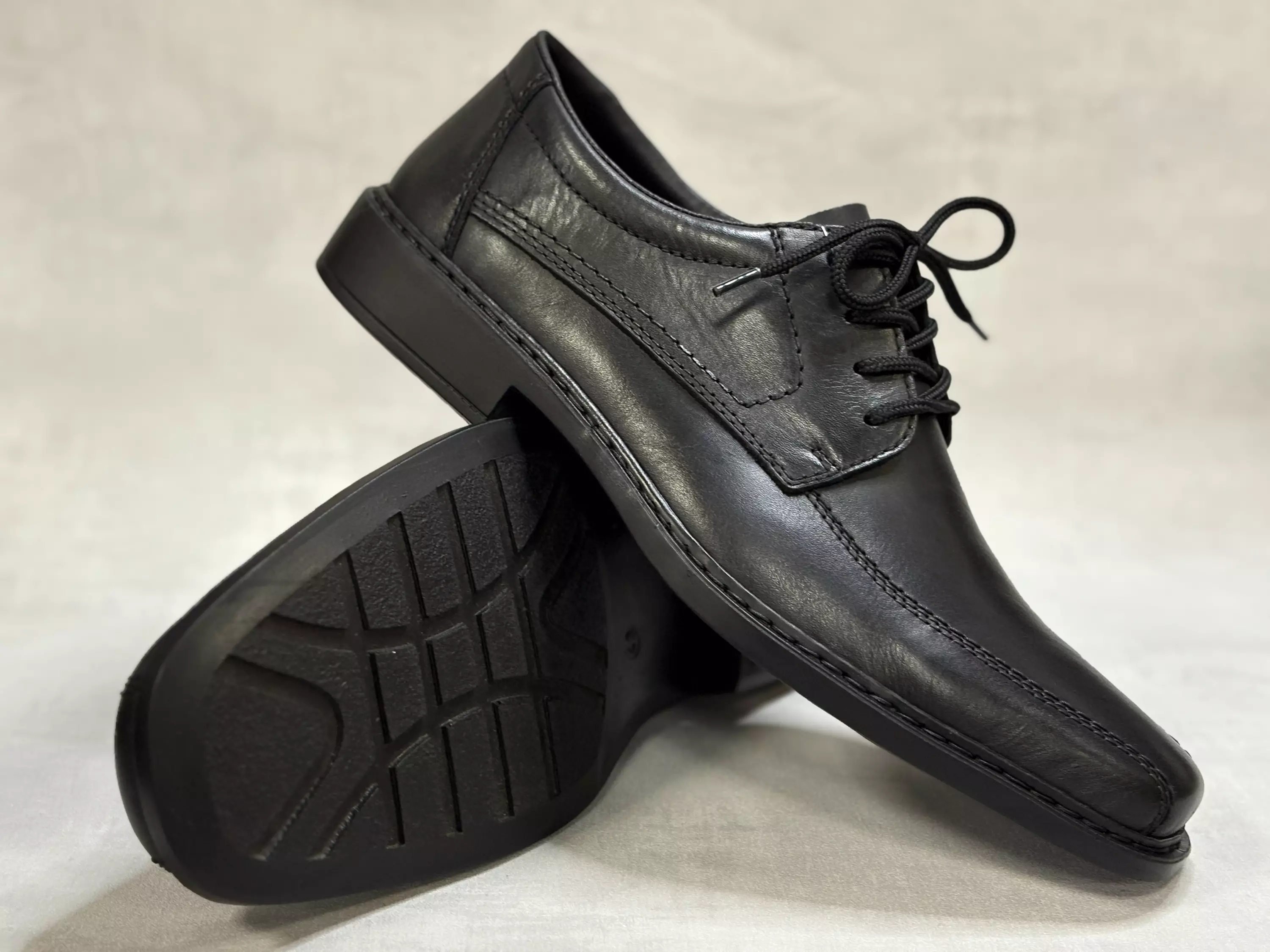 Mustat Rieker juhlakengät. Nauhallinen musta nahkakenkä erikoisleveällä lestillä. Leikkaukset ja tikkaukset antavat kengille reilusti ilmettä. Tyylikäs kapeneva kärki. Kannan korkeus noin 3cm ja pohjan korkeus päkiän alta noin 1cm.