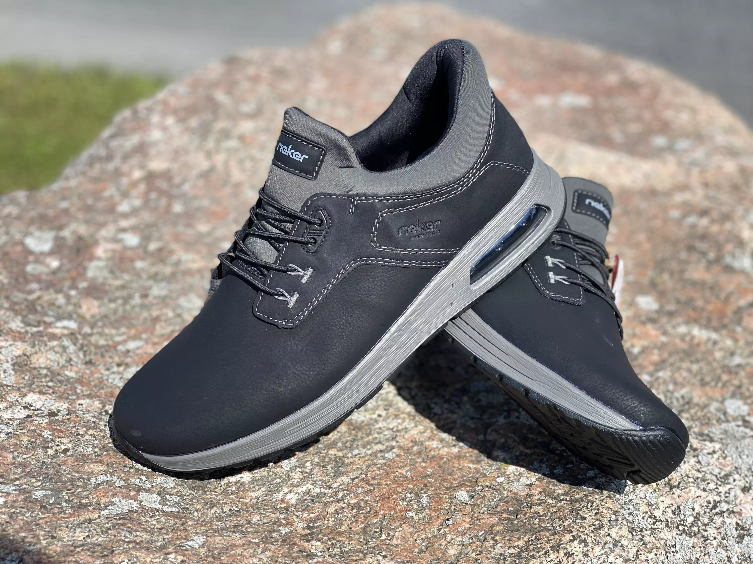 Mustat Rieker kävelykengät. Venykenauhat, joiden alimmissa nauhakujissa aksenttivärinä harmaata. Nauhat eivät ole säädettävät. Kengänsuun ympärystä ja tikkaukset ovat myös harmaat väriltään. Vaihdettavat Rieker Antistress-pohjalliset, joiden tilalle sujautat tarvittaessa omia tarpeitasi parhaiten vastaavat pohjalliset. Riekerin Ready2Go kenkälusikkakannalla varustetut Rieker kävelykengät!