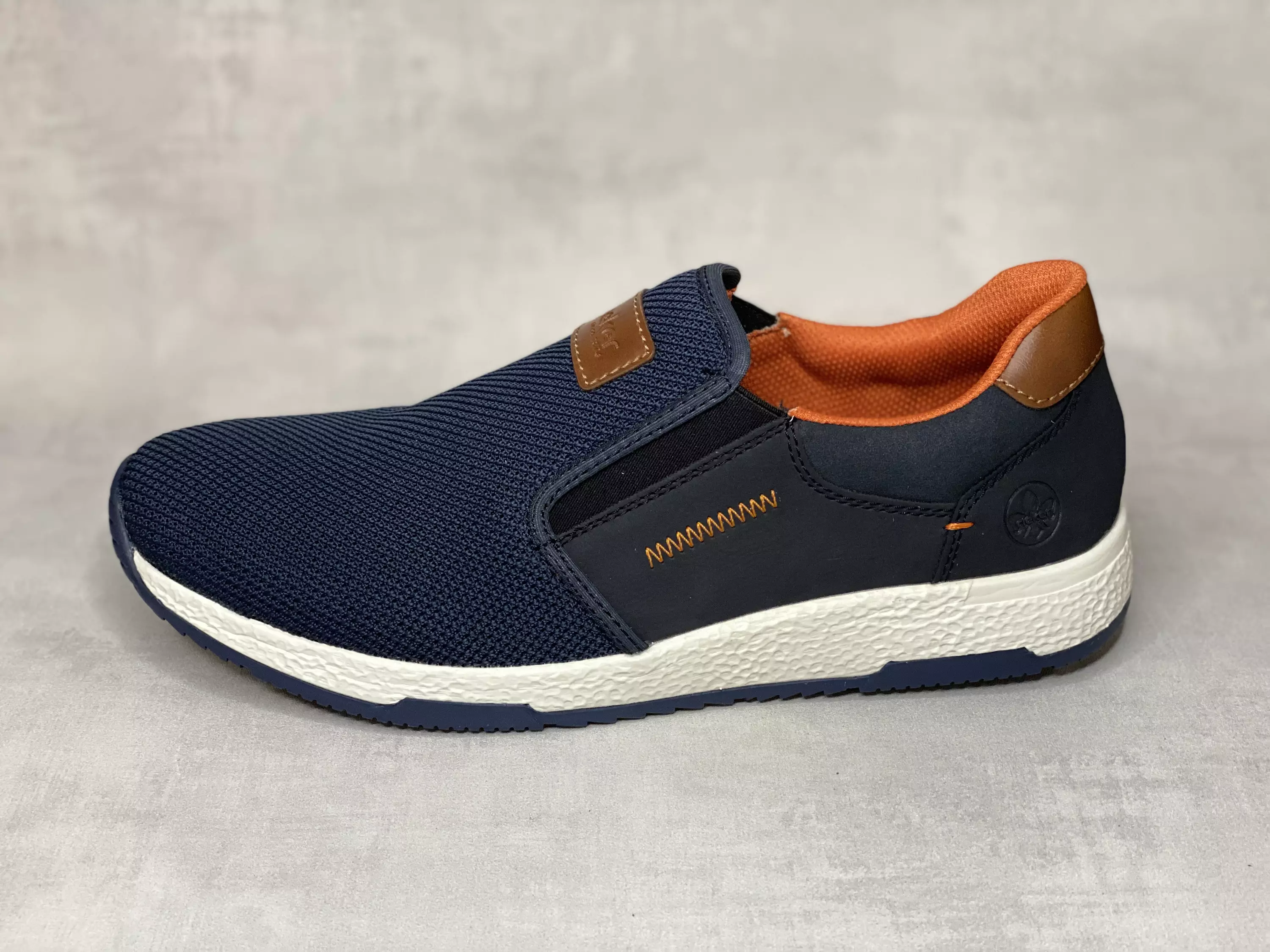 Tummansiniset Rieker kangaskengät, joissa oranssi aksenttiväri. Sisä- ja ulkosyrjällä pukemista helpottavat ja istuvuutta parantavat venykkeet. Leveä lesti.