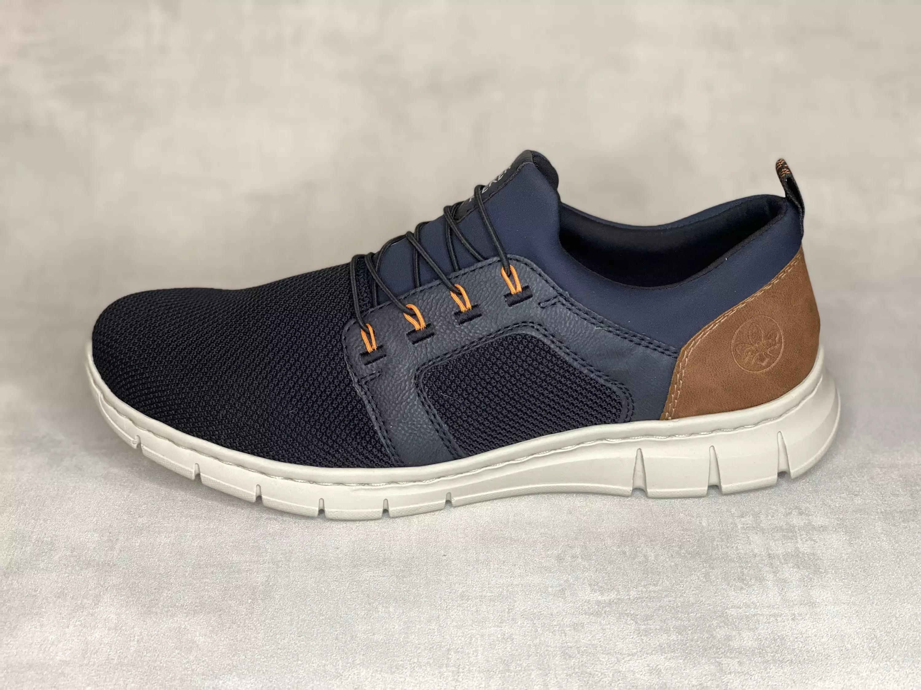 Tummansiniset miesten Rieker lenkkarit. Kiinteät venykenauhat. Nauhakujissa on aksenttivärinä oranssia ja kanrakappale on väriltään ruskea. Ulkopohjan sävy taittaa vaaleaan harmaaseen.