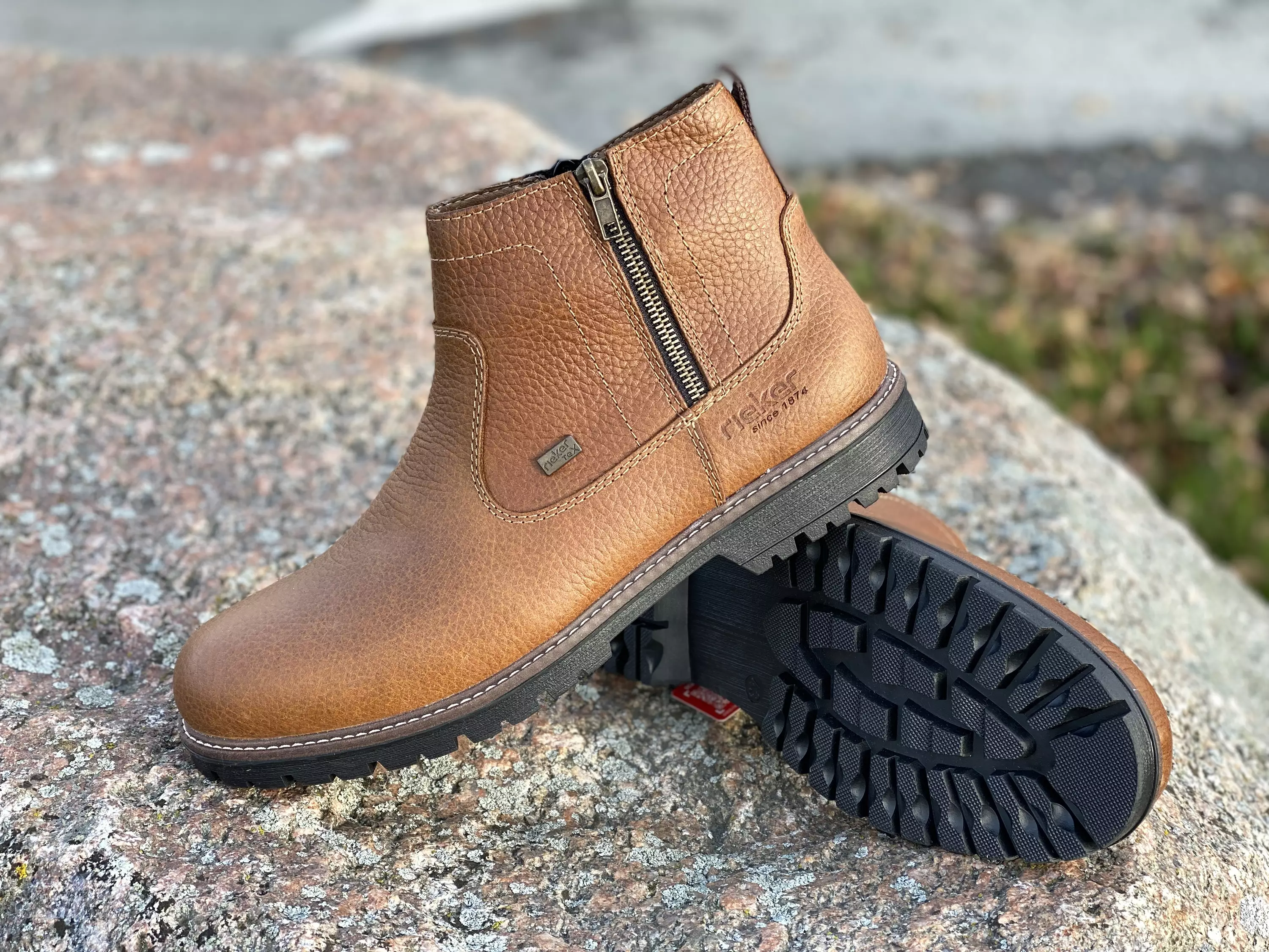 Ruskeat Rieker nilkkurit. Nahkaiset nilkkurit on varustettu kahdella vetoketjulla. Ulkosyrjälle sijoitettu vetoketju toimii myös kenkien yksityiskohtana. Pörröinen sisävuori auttaa jalkoja pysymään lämpiminä. RiekerTex kalvo puolestaan pitää huolen jalkojen kuviana pysymisestä. Kengän kantaosassa on tekstiilinen vetolenkki. Kiinteät huopapintaiset Rieker antistress pohjalliset.